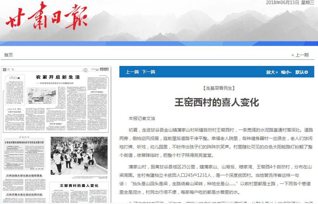 初夏,走进甘谷县金山镇蒲家山村所辖自然村王窑西村,一条宽阔的水泥路直通村落深处。道路两旁,侧柏迎风招展,庭前屋后道路干净平整。幸福老人院里,各种健身器材一应俱全,老人们悠闲地打牌、听戏,幼儿园里,不时传出孩子们的阵阵欢笑声。村里随处可见的白色太阳能路灯扮靓了整个街道,夜幕降临时,把整个村子照得亮亮堂堂。