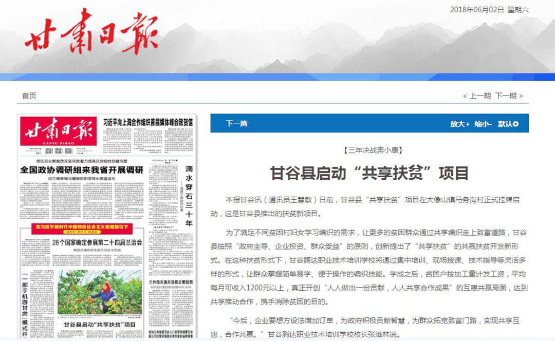 “今后,企业要想方设法增加订单,为政府积极贡献智慧,为群众拓宽致富门路,实现共享互惠,合作共赢。”甘谷腾达职业技术培训学校校长张维林说。