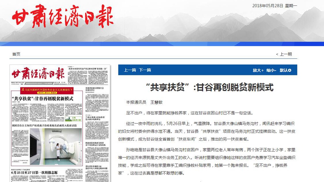 目前,甘谷县已在新兴、大像山、谢家湾、大庄等乡镇开展共享扶贫编织培训,培训期间每人每天可领取20元培训补助金。培训两个月后,预计300多人可在自己家里挣到一笔稳定的收入。其它覆盖全县贫困村的共享扶贫模式,正在积极筹备组织中。