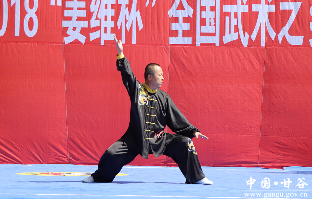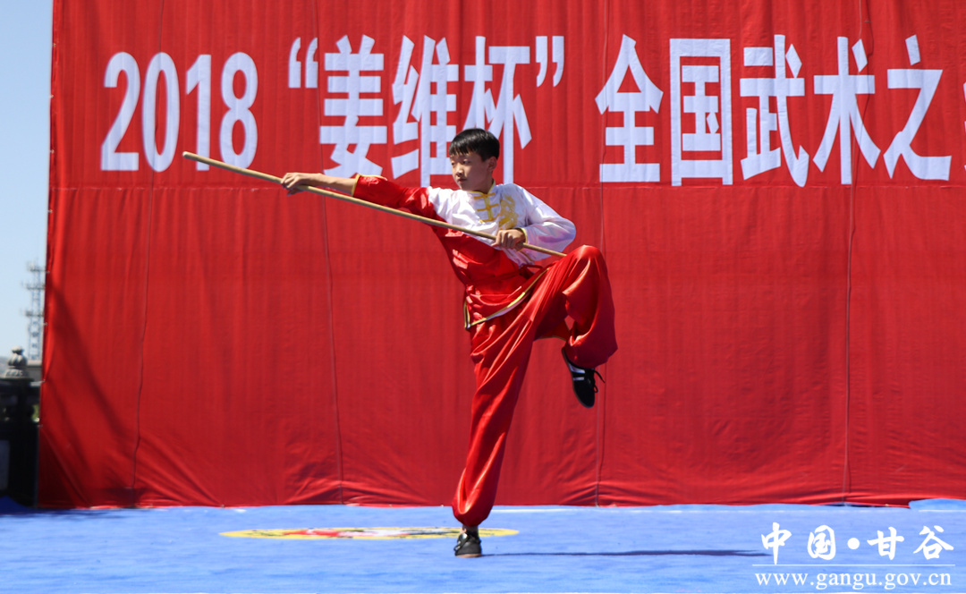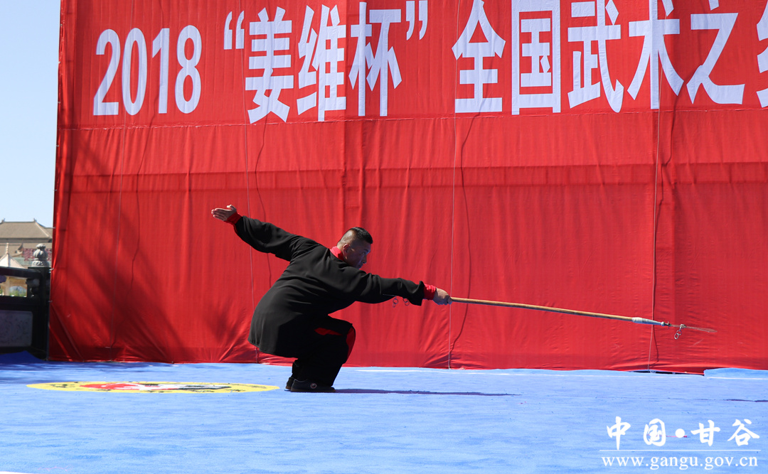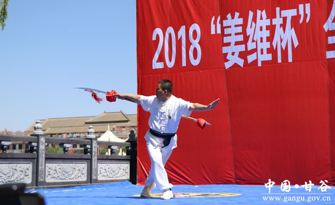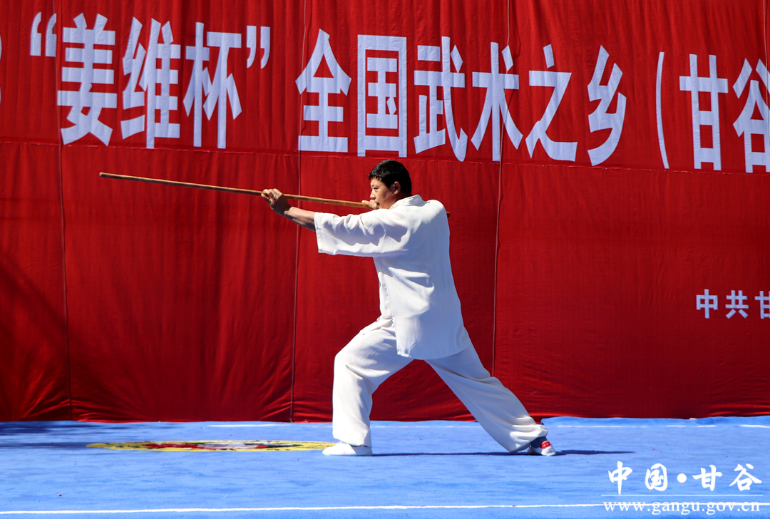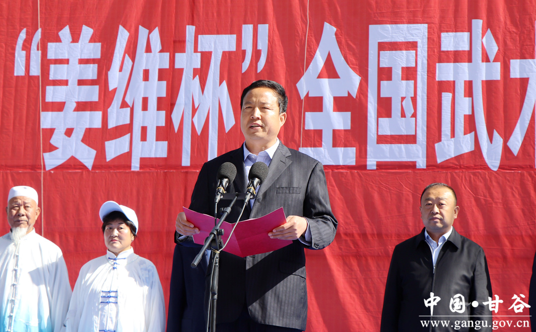 牛武军在致辞中说,甘谷历史悠久,人文荟萃,是“全国武术之乡”,素有崇文尚武的优良传统,武术文化源远流长,数千年来传承不息,涌现出以蜀汉大将军姜维为代表的一大批杰出人物,形成了极富地方特色的传统武术文化。近年来,县委、县政府大力支持武术文化研究,深入挖掘整理传统武术套路,广泛组织开展各类武术交流活动,武术事业得到了长足的发展,广大群众习武健身蔚然成风,武术健儿在国内大赛中屡获殊荣,我县先后荣获“全国群众体育先进县”和“全省发展体育产业先进县”称号。这次“姜维杯”武术交流大会的成功举办,为武术健儿搭建了交流切磋的良好平台,对培养新型武术人才,实施全民健身战略,推动武术事业发展具有十分重要的意义。相信通过各位武术名家和运动员的交流切磋,这次大会一定能够进一步传承和弘扬中华优秀武术文化,打造姜维武术品牌,将中华武术发扬光大,共同弘扬国粹。