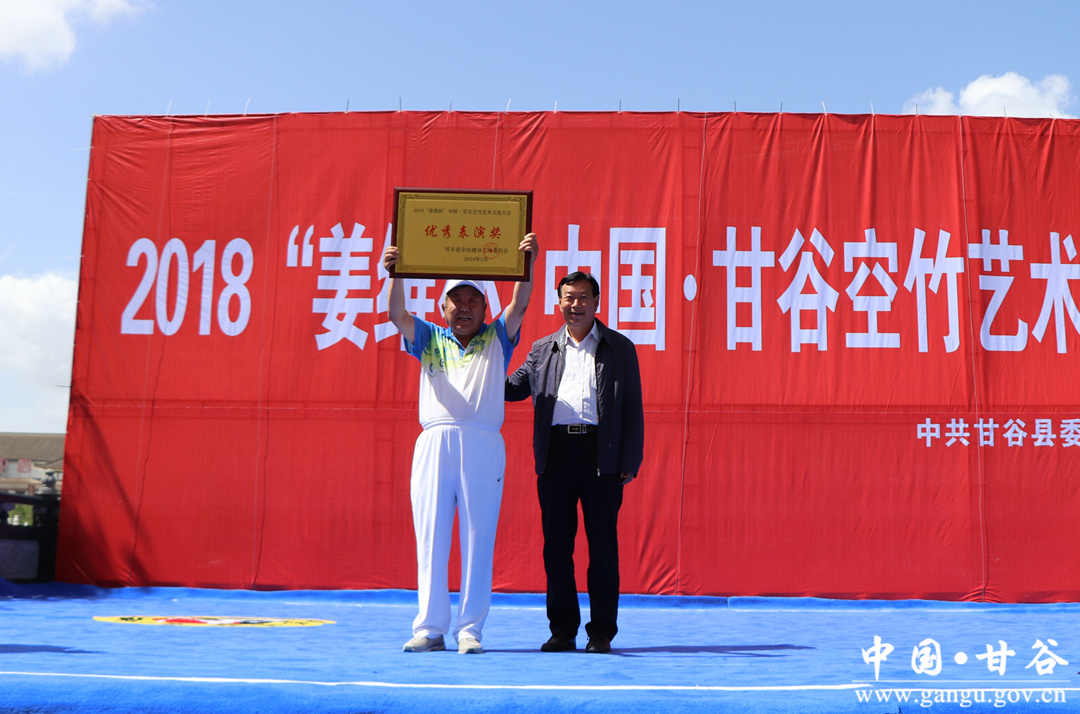 交流大会结束后,县领导为优秀表演队颁发了荣誉证书和奖牌;接受了表演队回赠的锦旗和书画。