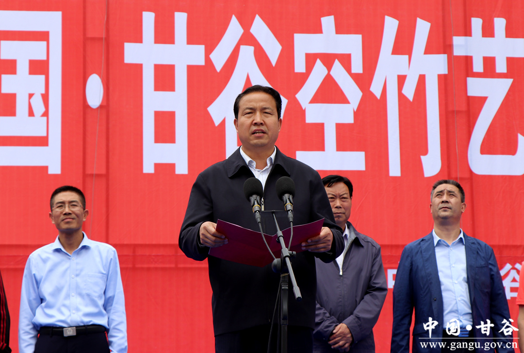 牛武军代表县四大组织向交流大会的成功举办表示热烈祝贺,向莅临赛会的来宾朋友表示热烈欢迎,向参加交流大会的各支参赛队伍及全体工作人员表示诚挚的问候。他说,空竹是首批国家级非物质文化遗产保护项目,也是深受广大人民群众喜欢的一项健身运动,对丰富广大群众文化体育生活,提高全民健身水平具有重要意义。近年来,县委县政府以举办各类体育赛事为契机,积极推进文化体育旅游深度融合,加快发展群众体育事业,加强公共体育设施建设,大力弘扬各类体育文化,着力营造全民健身良好氛围,全县群众在广泛参与体育健身活动中享受到了健康和快乐,全面身体素质和健康水平不断奇提高。本次空竹艺术交流大会是2018年大像山文化旅游节的一项重要活动内容,希望各代表对能够发扬“团结、友谊、交流、进步”的体育精神,相互促进,相互提高,使赛事真正成为一次学习、互相交流的文化体育盛会。通过赛会的成功举办,必将进一步促进甘谷体育事业的对外合作交流,激发全民健身热烈,推动甘谷群众体育事业蓬勃发展。