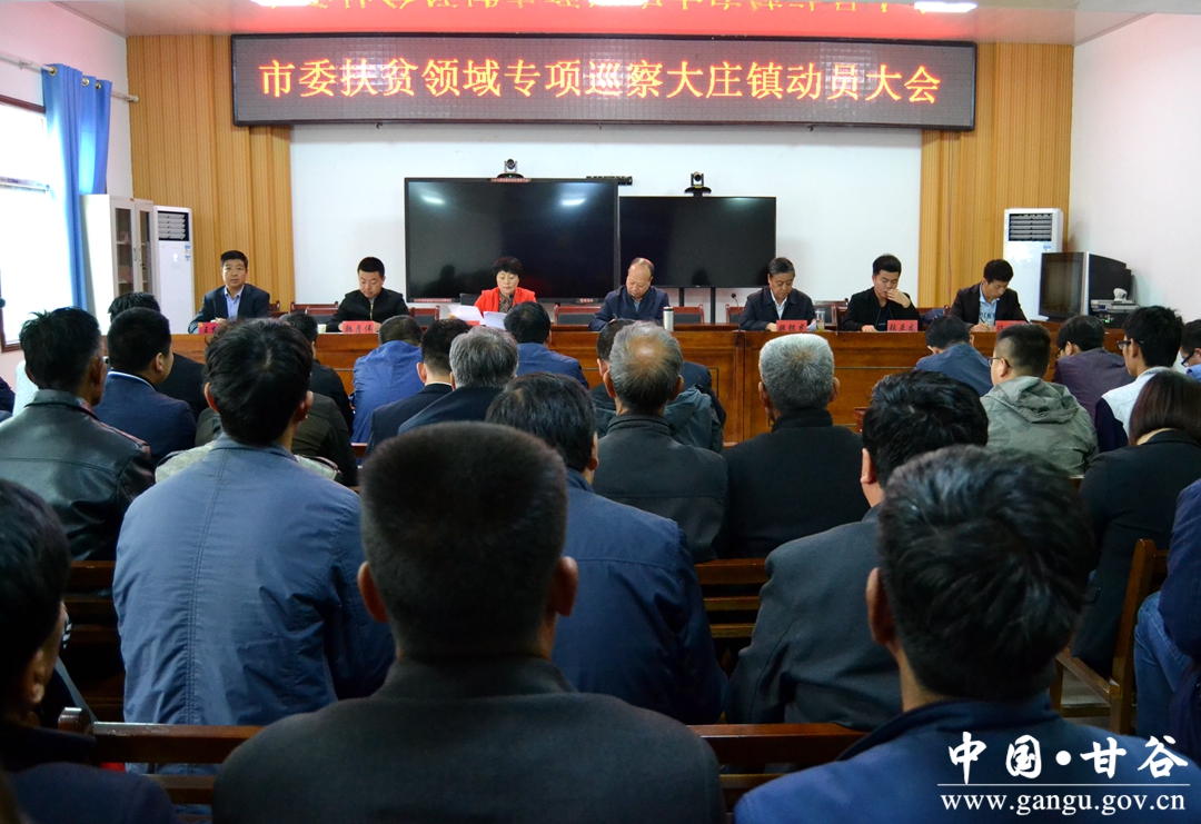 近日,市委扶贫领域专项巡察甘谷县大庄镇动员大会召开。市委第三巡察组组长、市纪委第三派驻纪检组组长石怀智,市委第三巡察组副组长、市纪委派驻市发改委纪检组长魏银虎,市委第三巡察组全体成员,县委常委、纪委书记、监委主任谢辉出席会议;全镇干部,镇属单位、各行政村负责人参加会议。
