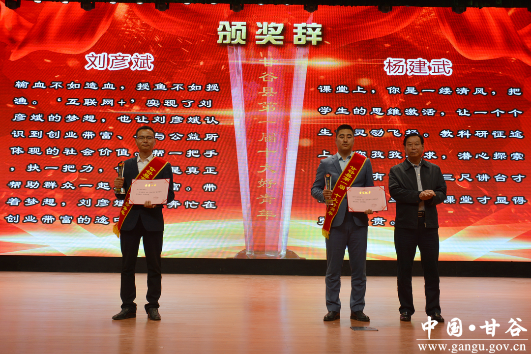 ( 县人大常委会副主任王金生为“甘谷县第一届十大好青年”刘彦斌、杨建武颁奖)