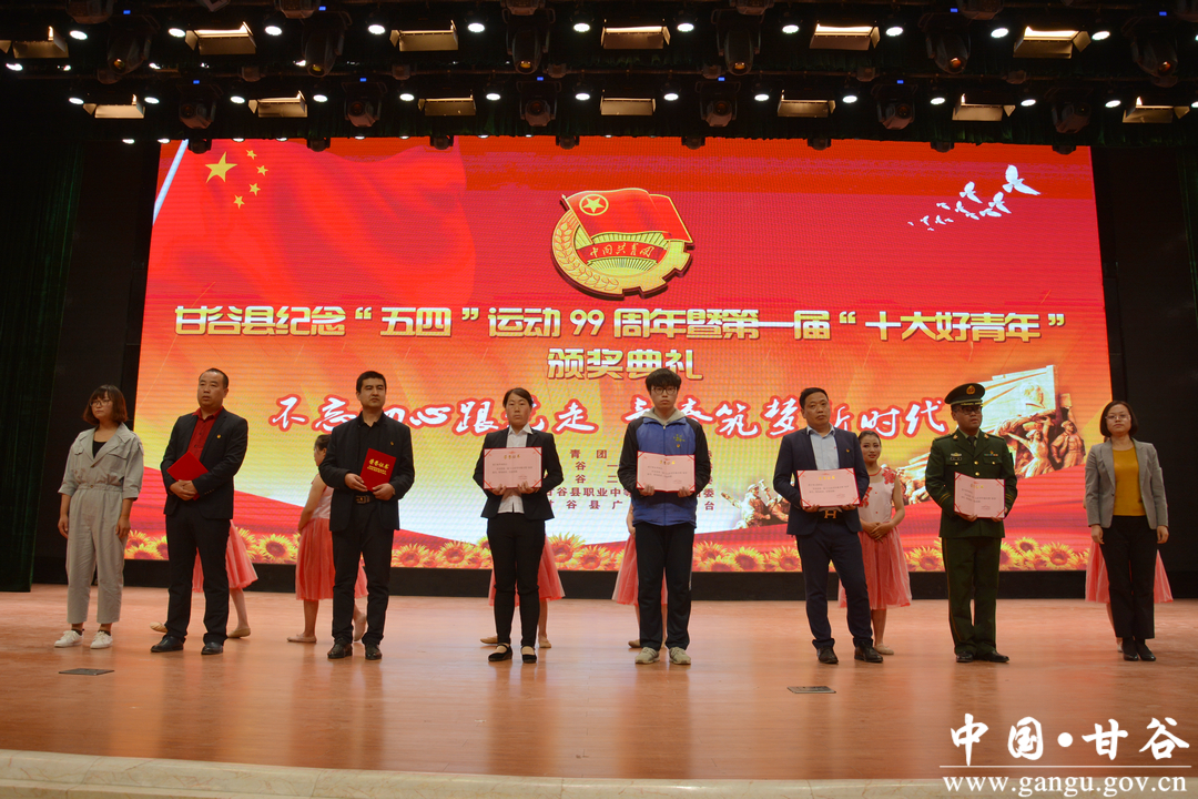 5月3日,甘谷县纪念五四运动99周年暨第一届“十大好青年”颁奖典礼在甘谷大剧院隆重举行。县委常委、宣传部长张庆元,县人大常委会副主任王金生,副县长牛武军,县政协副主席马清平出席颁奖典礼;各相关单位负责人,各乡镇团委,县直属团(工)委、团总支、团支部负责人,受表彰的先进组织负责人、先进个人和部分学生代表共计1000多人参加颁奖典礼。
