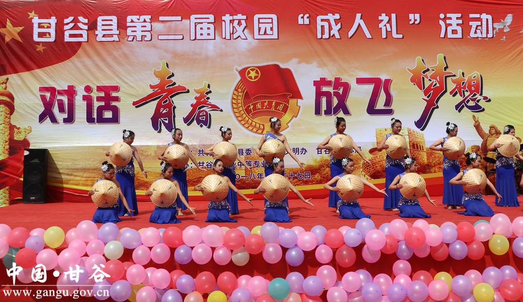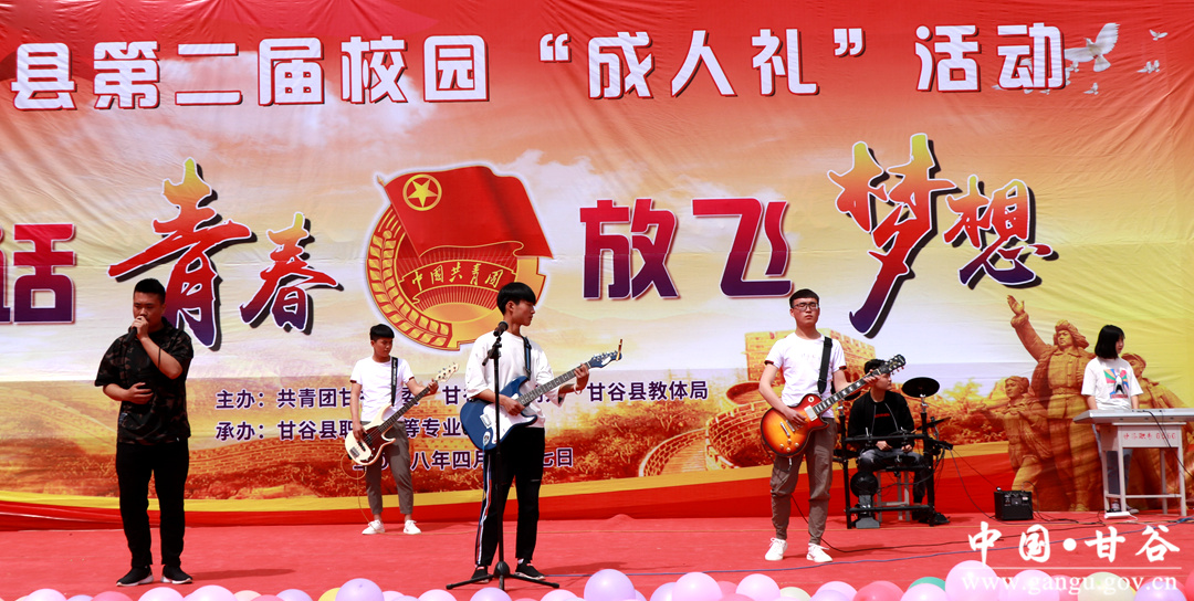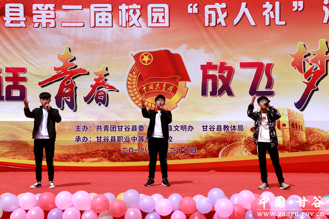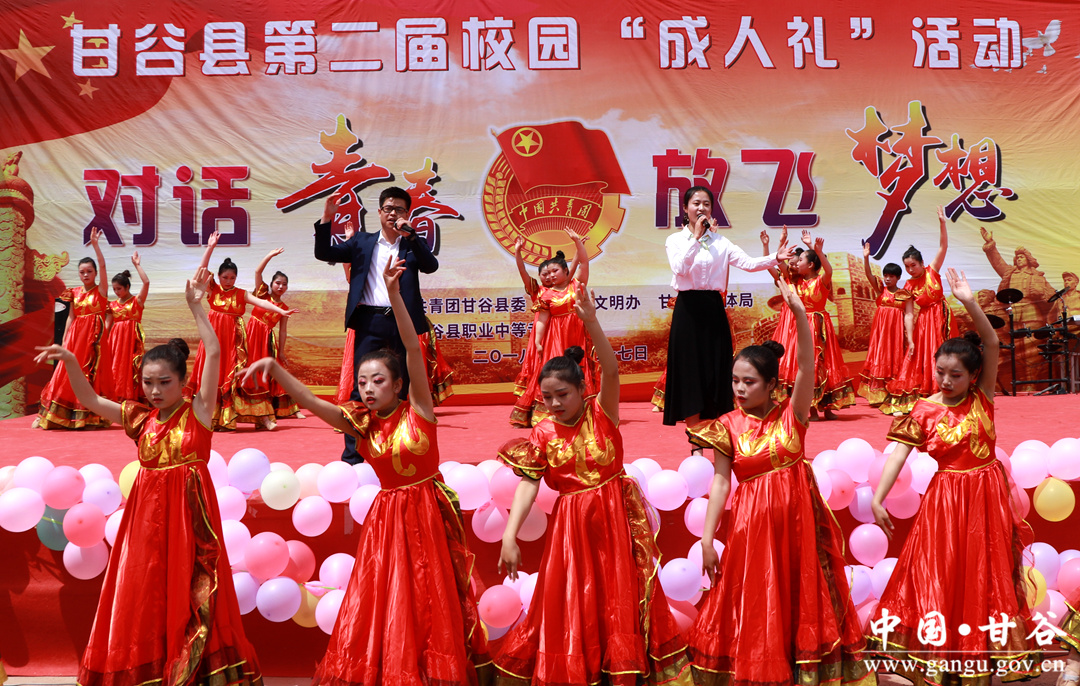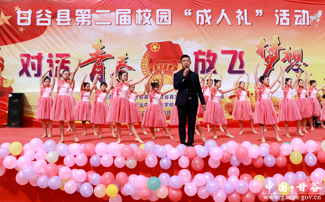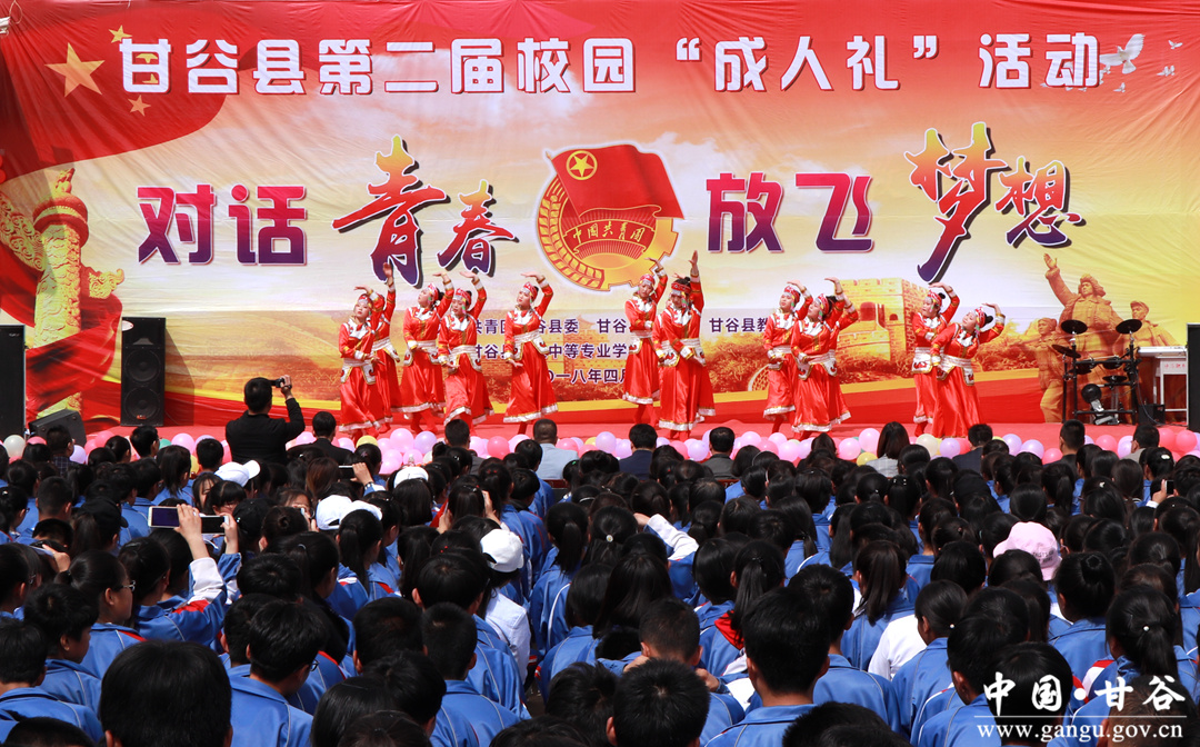 4月27日,由共青团甘谷县委、县文明办、县教体局主办的第二届校园成人礼“对话青春 放飞梦想”活动在甘谷县职业中等专业学校举行。县委常委、组织部长冯建新,县文明办、团县委、县机关工委、县直属中学团委等负责人出席活动;县直属中学学生代表、家长代表、甘谷职专一、二年级全体师生参加活动。