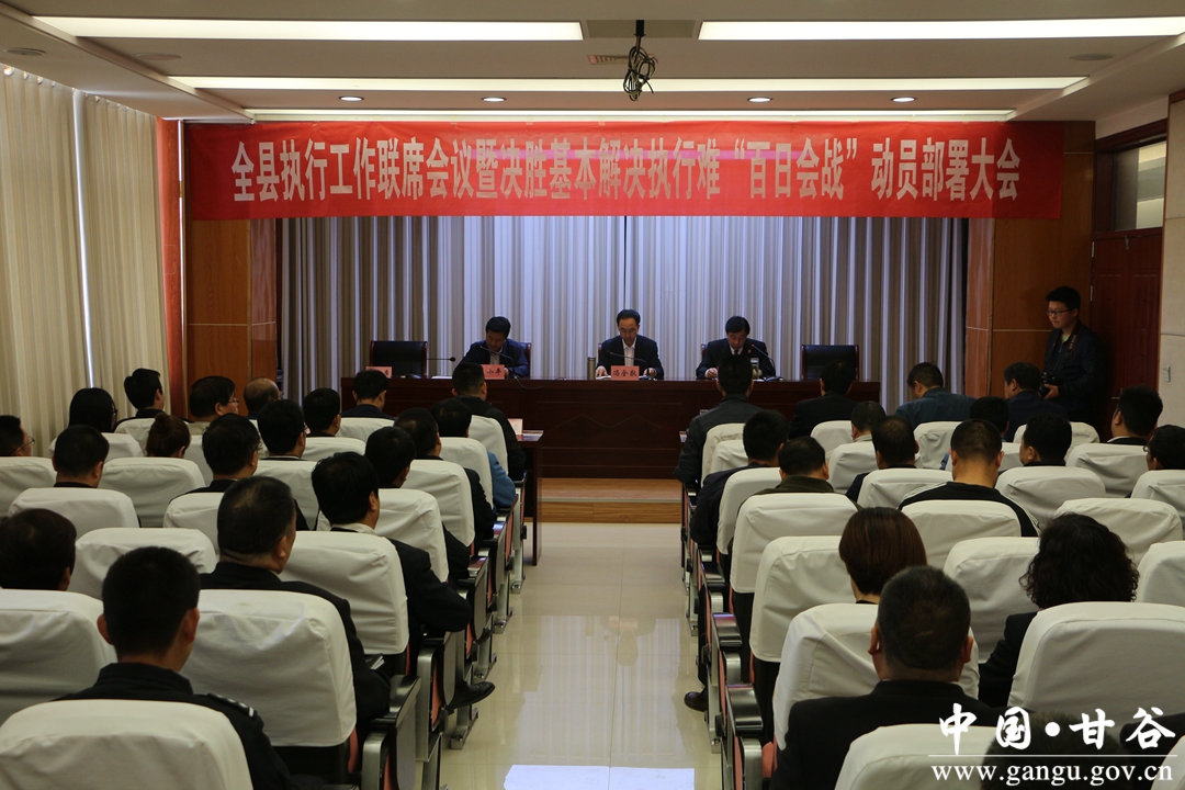 4月26日,甘谷县召开执行工作联席会议暨决胜基本解决执行难“百日会战”动员部署大会。县委常委、政法委书记冯全敬出席会议并讲话,县执行联席会议成员单位负责人和县法院党组全体成员、各庭室负责人及执行局全体干警共计60余人参加会议。