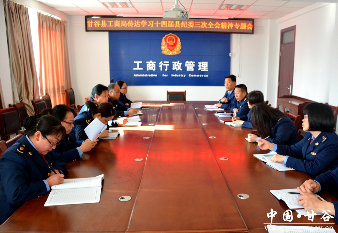 近日,甘谷县工商局召开专题会议,传达学习十四届县纪委三次全会精神,会议由县局党组成员、纪检组长付敏主持,县局领导班子成员,机关各股室,各工商所、分局负责人参加了会议。