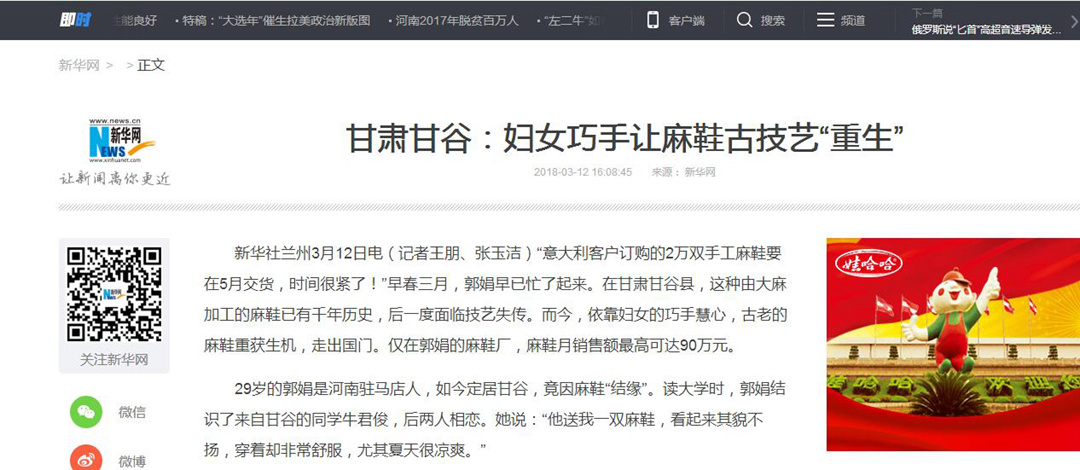 “意大利客户订购的2万双手工麻鞋要在5月交货,时间很紧了!”早春三月,郭娟早已忙了起来。在甘肃甘谷县,这种由大麻加工的麻鞋已有千年历史,后一度面临技艺失传。而今,依靠妇女的巧手慧心,古老的麻鞋重获生机,走出国门。仅在郭娟的麻鞋厂,麻鞋月销售额最高可达90万元。