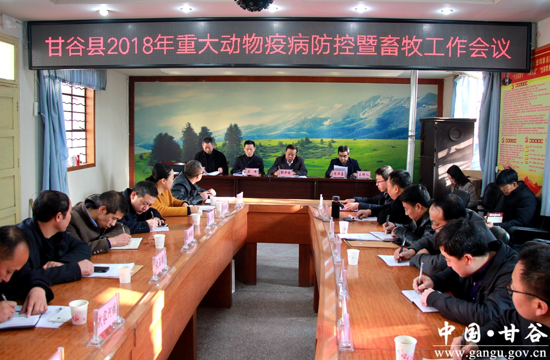 3月9日,甘谷县召开重大动物疫病防控暨畜牧工作会议,传达全市畜牧工作会议精神,安排部署2018年动物防疫及畜牧重点工作。副县长郭中校出席会议并讲话;各乡镇、相关部门负责人参加会议。