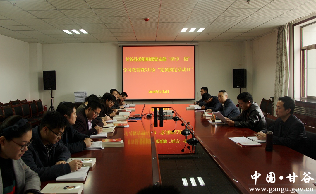 3月2日,甘谷县委组织部党支部开展3月份“党员固定活动日”活动,全体党员集体学习了《中国共产党中央委员会关于修改宪法部分内容的建议》《中国共产党第十九届中央委员会第三次全体会议公报》,传达学习了全县脱贫攻坚领导小组第一次扩大会议精神。