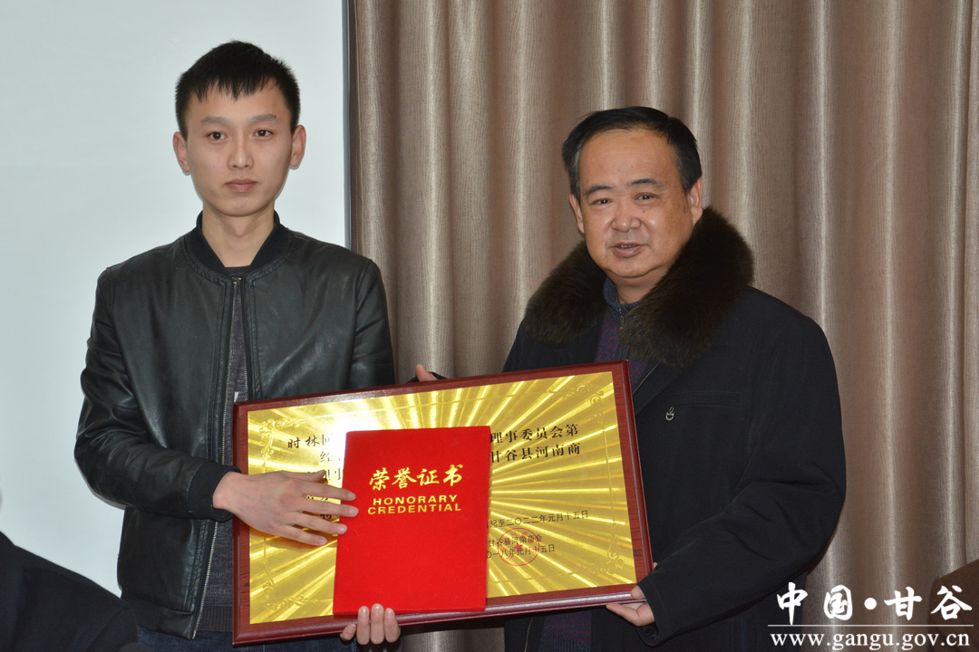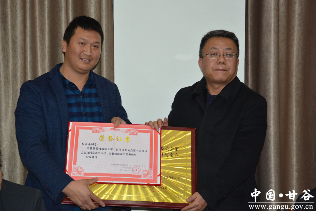 座谈会上,王刚作了讲话,王刚、谢兴明分别为新增选甘谷县河南商会第一届理事委员会常务理事朱诗海、时林颁发了荣誉证书;甘谷县河南商会副会长崔威炯作了工作报告。