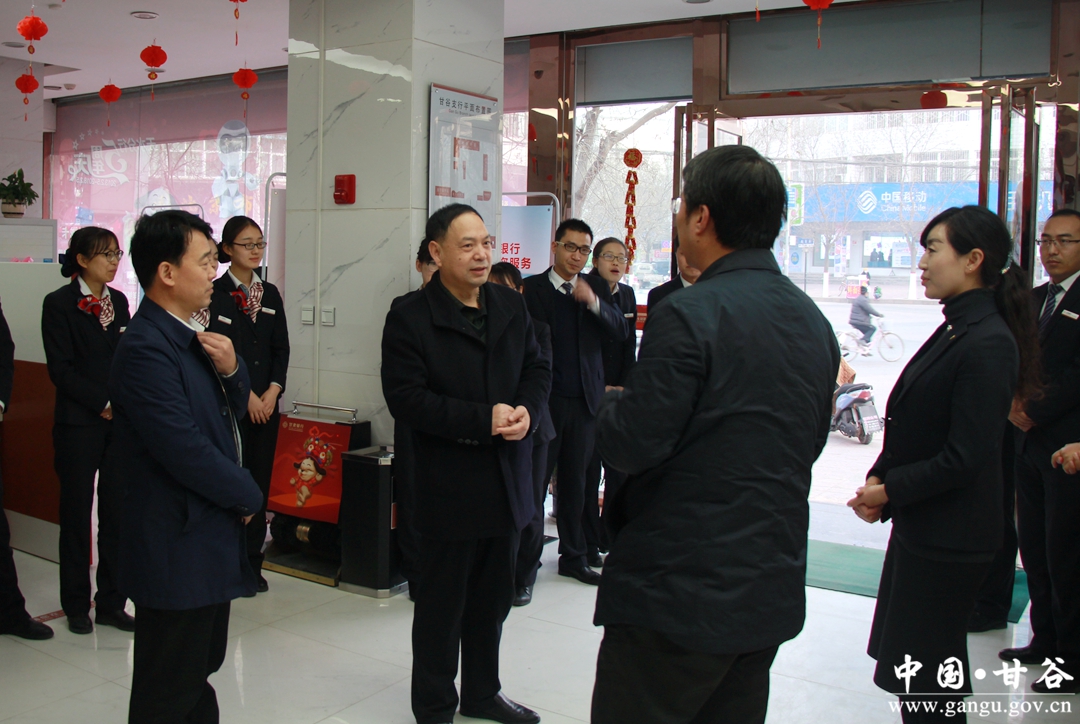 每到一处,王志高与工作人员一一握手,详细询问一年来的存款、贷款业务以及效益情况,了解单位干部职工工作和生活情况,对他们为甘谷经济发展作出的贡献表示感谢。王志高说,今年,各金融机构全力扩大信贷规模,丰富了放贷政策和手段,实现了融资突破,为推动甘谷县域经济和金融业的良性互动、健康发展做出了突出的贡献。同时希望在新的一年,全县金融系统要认真学习贯彻党的十九大精神,按照中央和省市县确定的各项方针政策,不断创新工作机制,优化收支结构,提高保障能力,深化财政改革,加强财政监管,积极研究探索支持地方经济建设的新思路、新措施,进一步提高服务水平,为促进全县经济社会和各项事业发展作出新的贡献。