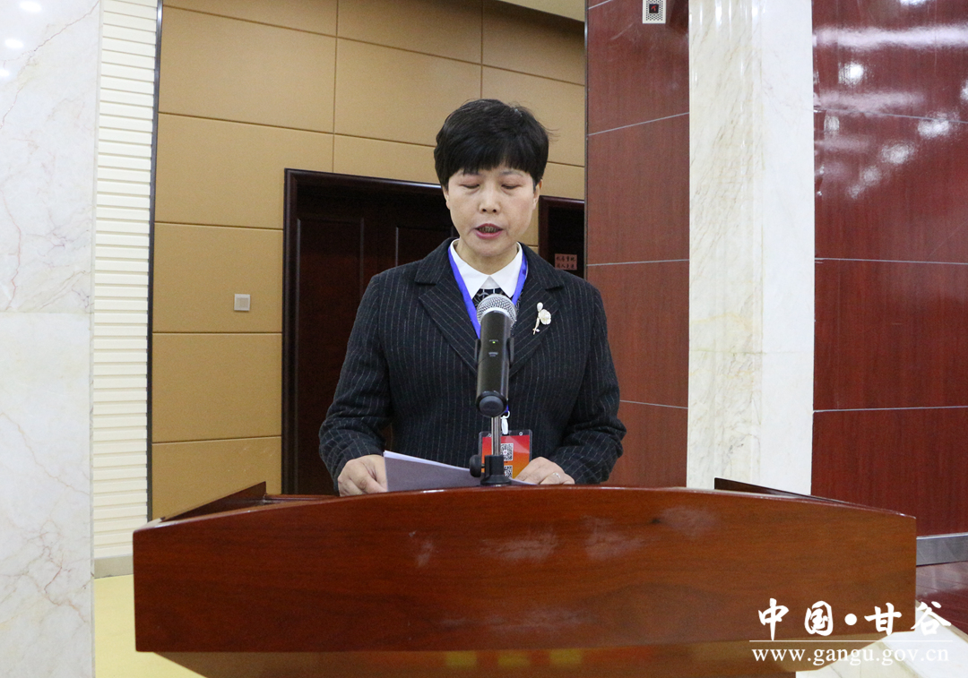 县妇联主席杨晓涛代表甘谷县妇女联合会第十五届执行委员会作了《迈向新时代,踏上新征程,为决胜全面建成小康社会贡献巾帼力量》的工作报告。报告对过去五年甘谷妇女发展和妇女工作的总结和回顾,确定了今后五年甘谷县妇女事业发展的目标,报告提出了今后五年妇女工作的指导思想和主要任务:以习近平新时代中国特色社会主义思想武装头脑、指导实践、推动工作。以高度的责任感和使命感,大力宣传男女平等基本国策,切实维护妇女儿童合法权益,积极参与社会管理与创新,密切联系和服务妇女群众,不断优化妇女儿童的生存发展环境,真正把妇联组织建设成为党开展妇女工作的坚强阵地和广大妇女信赖的温暖之家。报告还提出了今后五年妇女事业发展的奋斗目标:男女平等基本国策、儿童优先原则和妇女儿童发展规划得到全力推进落实;妇女在经济、政治、文化、社会和家庭生活等领域的平等权利得到更好地实现;妇女综合素质和创业能力进一步提升;依法保障妇女儿童权益的机制进一步健全,妇女儿童发展环境更加优化,妇女事业发展水平不断提高。
