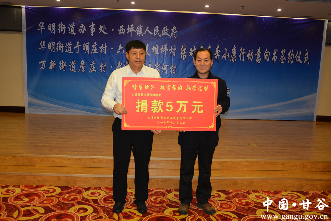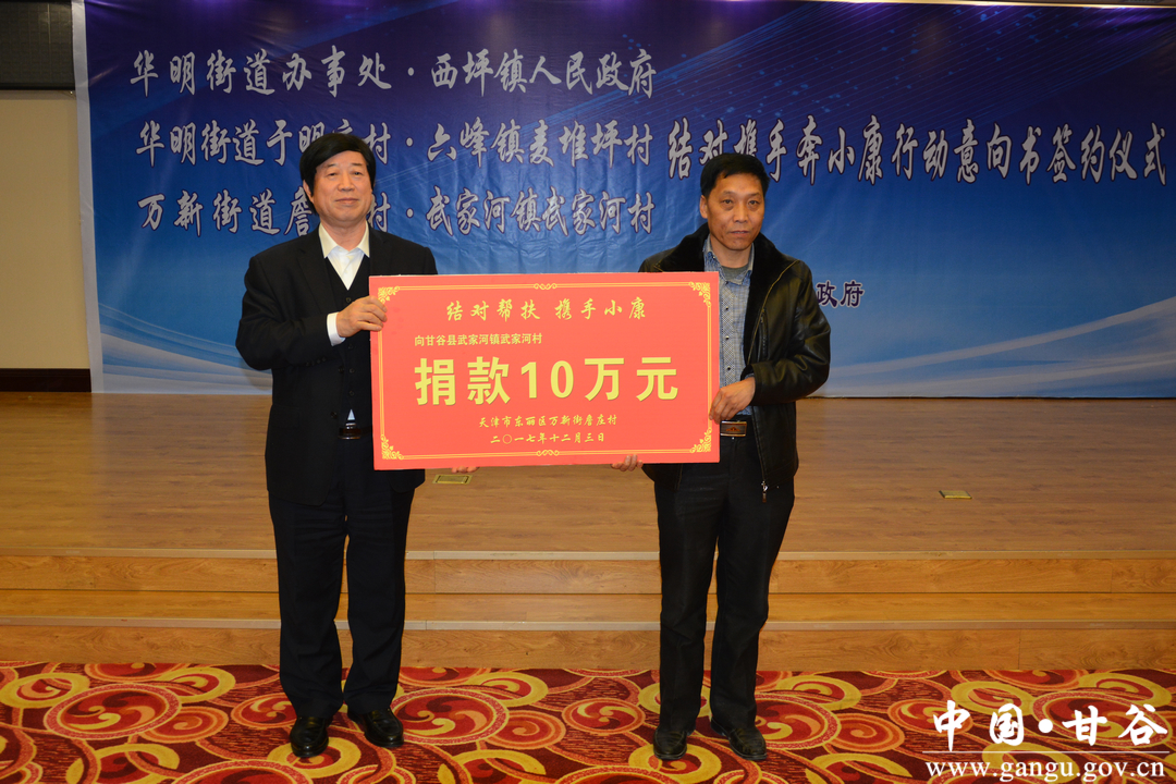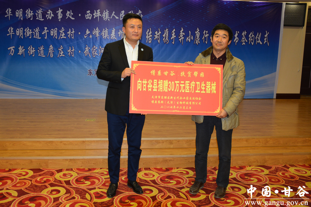 座谈会上,东丽区华明街道办事处、万新街道詹庄村、华明街道于明庄村分别与西坪镇人民政府、武家河镇武家河村、六峰镇麦堆坪村签订了帮扶意向书;天津安达集团股份有限公司、新可绿色食品有限公司与甘谷县人社局分别签订了帮扶意向书;东丽区人民政府向甘谷县捐赠了900万元教育帮扶资金、向我县贫困户捐赠25万元慰问金;万新街道詹庄村、华明街于明庄村分别向武家河村、六峰镇麦堆坪村捐赠了10万元帮扶资金;东丽区博奥赛斯企业向我县贫困乡镇卫生院捐赠了价值30万元的器械设备;天津金桥聚鑫实业有限发展公司和好为节能环保科技发展有限公司分别向我县优秀贫困学生捐赠了5万元慰问金。