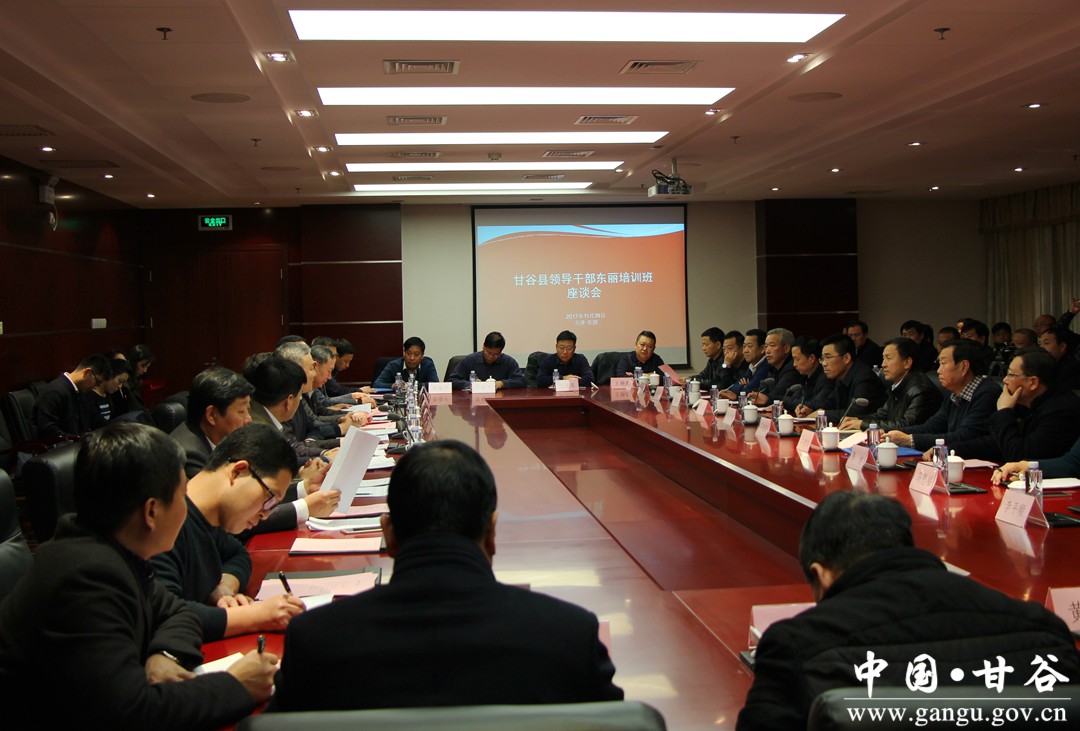 副区长杨灏,区政协副主席、华明街党委书记郑立;甘谷县委常委、组织部长冯建新,县人大常委会副主任王金生、副县长朱德勇、县政协副主席陈旭出席座谈会。东丽区委组织部、区委党校、区交流办有关负责人及我县52名参训学员参加座谈会。