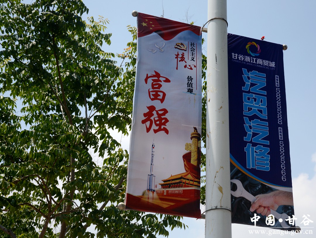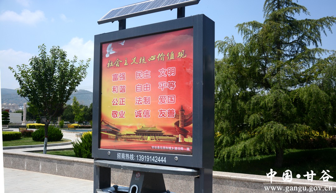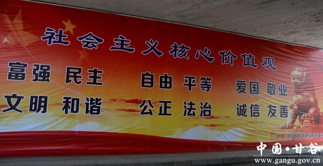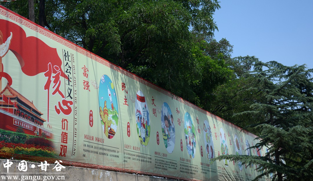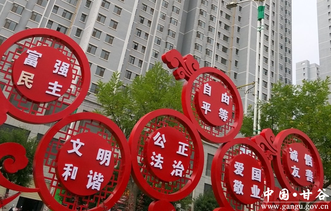 在甘谷,无论是车站、广场、市场、超市等人员密集场所,还是教育、医疗、旅游等重点区域,随处都能看到社会主义核心价值观,“24字”就像空气和水一样存在于群众生活中,并以喜闻乐见的形式展现社会主义核心价值观的潜在内涵,成为“百姓日用而自觉的行为准则”。