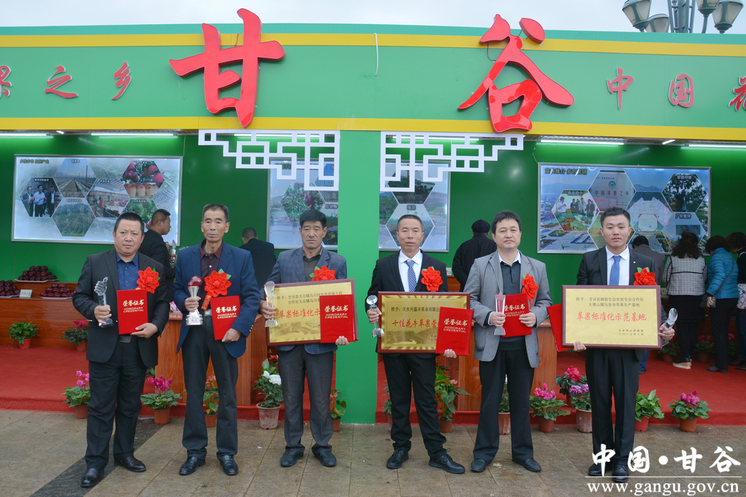苹果宣传推介会上,甘谷县谢家湾乡马家窑村何胜虎荣获花牛苹果大奖赛银奖,大像山镇马务寺苹果示范园和大石镇马川村苹果示范园被评为全市花牛苹果标准化示范基地,天水兴盛果业有限公司被评为全市十佳花牛苹果营销企业,果业局李云杰被评为全市果品产业发展先进工作者,金山镇谢家湾村刘孝军、白家湾乡康家坪村康小红等20名种植户被评为全市花牛苹果种植能手。