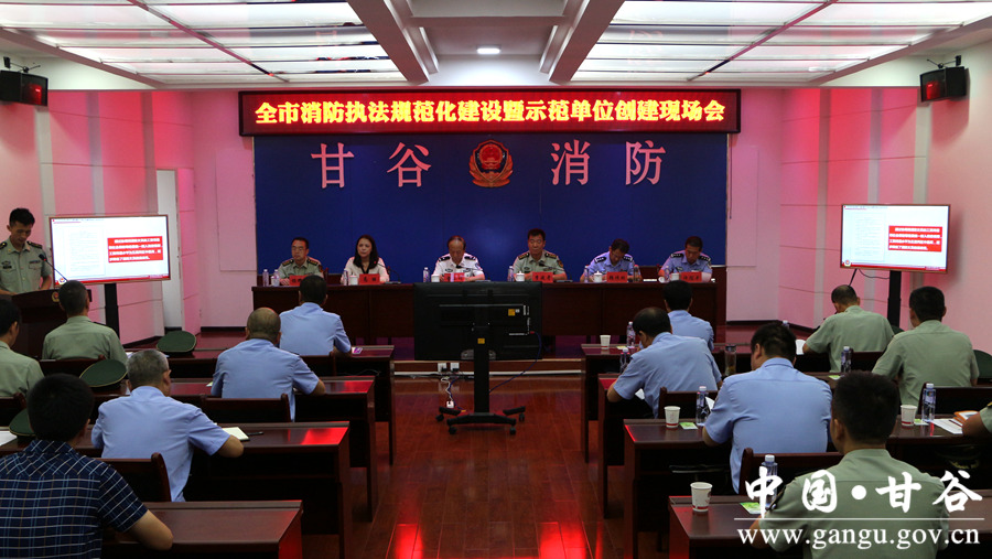 为深入贯彻落实党的十八届六中全会精神和公安部党委关于全面建设法治公安的决策部署,全面提升消防执法规范化建设水平,7月25日,全市执法规范化建设暨消防安全示范单位创建现场会在甘谷县召开。市公安局常务副局长曹小明,市公安消防支队长郭学锋、政委李延奇出席会议,副县长高丽,各县区公安局、消防大队负责人及部分防火监督干部参加会议。 会议由李延奇主持。会上,曹小明作了讲话,高丽致辞,县公安消防大队负责人交流汇报了执法规范化建设经验做法,甘谷尚都百汇商贸有限公司有关负责人介绍了消防安全示范单位建设经验。