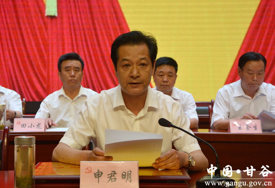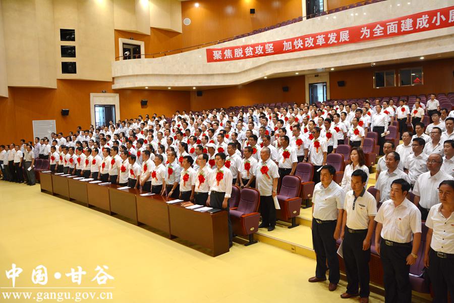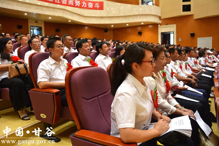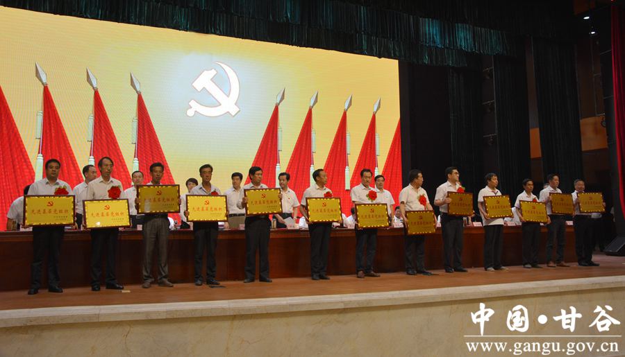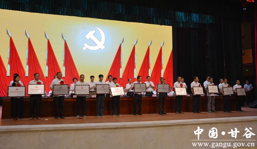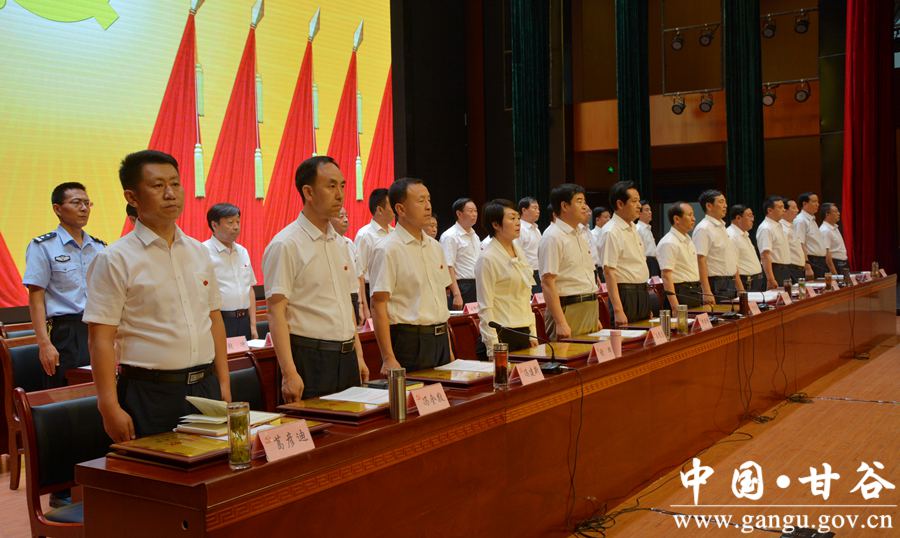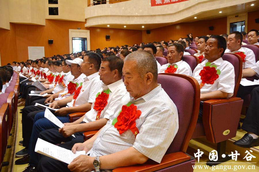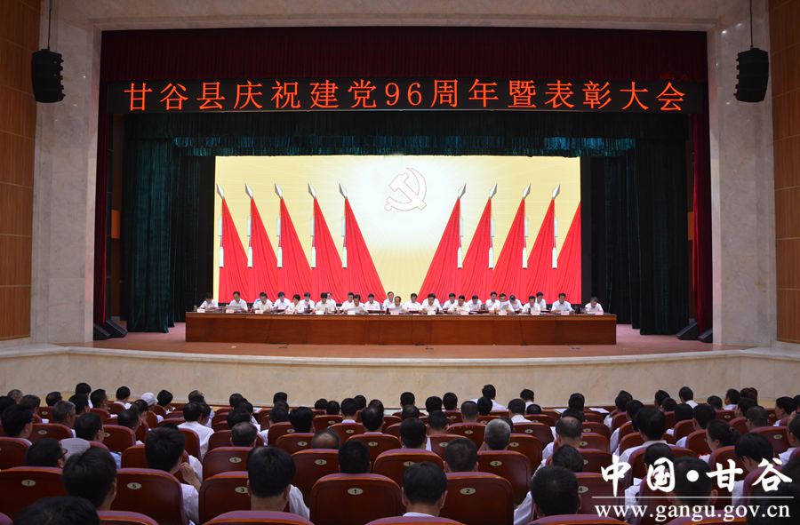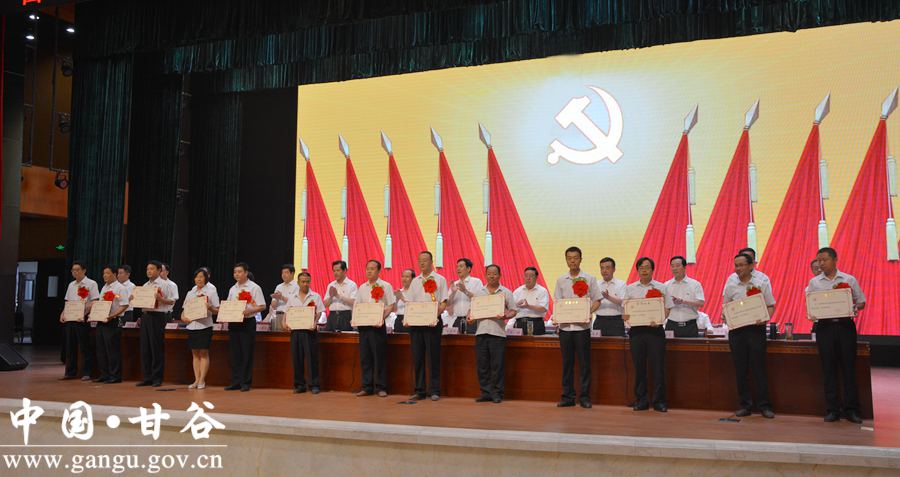 6月29日下午,甘谷县隆重召开庆祝中国共产党成立96周年暨表彰大会,重温党的历史,缅怀革命先烈,回顾发展成就,表彰先进典型,弘扬时代新风,进一步动员全县各级党组织、广大党员,更加清醒地认识我们党所肩负的时代重任和历史使命,更加自觉地传承弘扬党的优良传统,更加有力地加强和改进党的建设,为打赢脱贫攻坚战、全面建成小康社会提供坚强组织保证。 县委书记贾忠慧,县人大常委会主任令建民,县委副书记、县长申君明,县政协主席马骥等县四大组织全体党员领导干部出席大会;县政协副主席陈旭、马清平应邀出席大会。各乡镇党委书记、乡镇长、党委副书记、党建办主任;县直机关单位党(工)委书记、副书记,党总支、党支部书记;受表彰的先进基层党组织负责人、优秀共产党员、优秀党务工作者,以及党建示范点党组织书记,共计350多人参加会议。 县委副书记、县长申君明主持大会。会上,县委书记贾忠慧作了讲话,县委副书记任佩光宣读了《中共甘谷县委关于表彰先进基层党组织、优秀共产党员和优秀党务工作者的决定》,县委常委、组织部长冯建新宣读了《中共甘谷县委关于命名表彰奖励全县基层党建示范点的决定》。