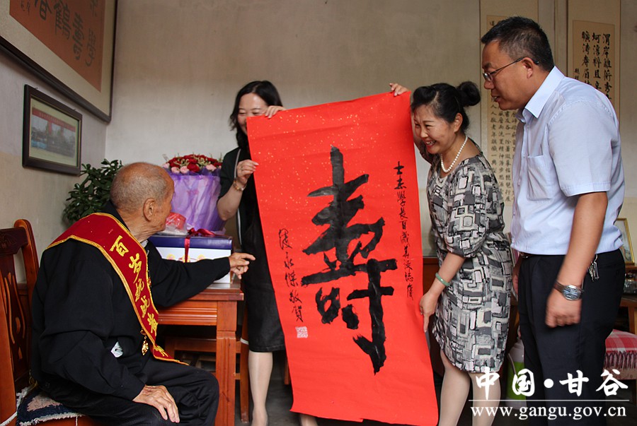 在抗战老兵王士杰家中慰问时,正巧赶上老人今年百岁寿诞,王心红、姚惠珍等领导为老人精心准备了鲜花和蛋糕,佩戴上了写有“百岁抗战黄埔老兵”的绶带,赠送了由甘肃省黄埔军校同学会会长寇永杰先生题写的“寿”字书法作品,与其家人一起为老人祝寿,与老人合影留念。