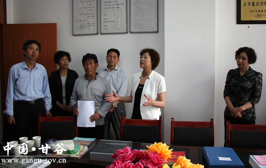 温利平对甘谷县宗教工作给予了充分肯定。她指出,甘谷县委、县政府认真贯彻落实中央、省、市统战和民族宗教工作会议精神,高度重视宗教工作,以团结引导为抓手,以健全机制为关键,以依法管理为根本,以维护和谐稳定为核心,努力促进宗教与社会主义社会相适应,在宗教场所悬挂与社会主义核心价值观,宗教方针、政策等内容的宣传牌,向信教群众传播正能量,弘扬中华优秀文化,着力推动宗教工作上水平、上台阶。 就下一步工作,温利平要求,甘谷县要认真学习习近平总书记在全国宗教工作会议上的重要讲话精神,深入贯彻落实中央、全省、全市宗教工作会议精神,以此次调研为契机,坚持问题导向,补齐工作短板,狠抓纵深落实,进一步贯彻党的民族宗教政策,发挥好宗教在推动经济社会发展中的积极作用和在信教群众中的特殊作用,团结引导信教群众积极投身到发展生产、维护稳定、促进和谐的主旋律上来,为推动甘谷县社会和谐稳定、经济快速发展作出新的贡献。
