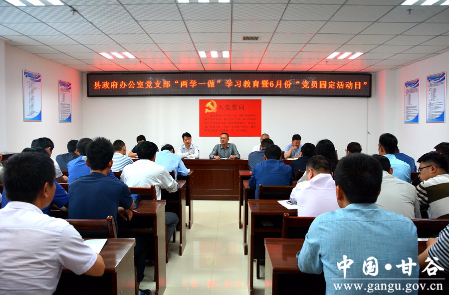 “两学一做”学习教育开展以来,县政府办党支部按照县上总体部署要求,紧密联系工作实际,严格落实“规定动作”,探索创新“自选动作”,采取“活动日+学习日=集中学习日”“活动日+服务日=服务群众日”“活动日+主题日=红色主题日”等“党员固定活动日+”模式,使组织生活内容上接“天线”突出指导性,下接“地气”更具实效性,让支部“活”起来,党员“动”起来,更好发挥党支部的战斗堡垒和党员的先锋模范作用。