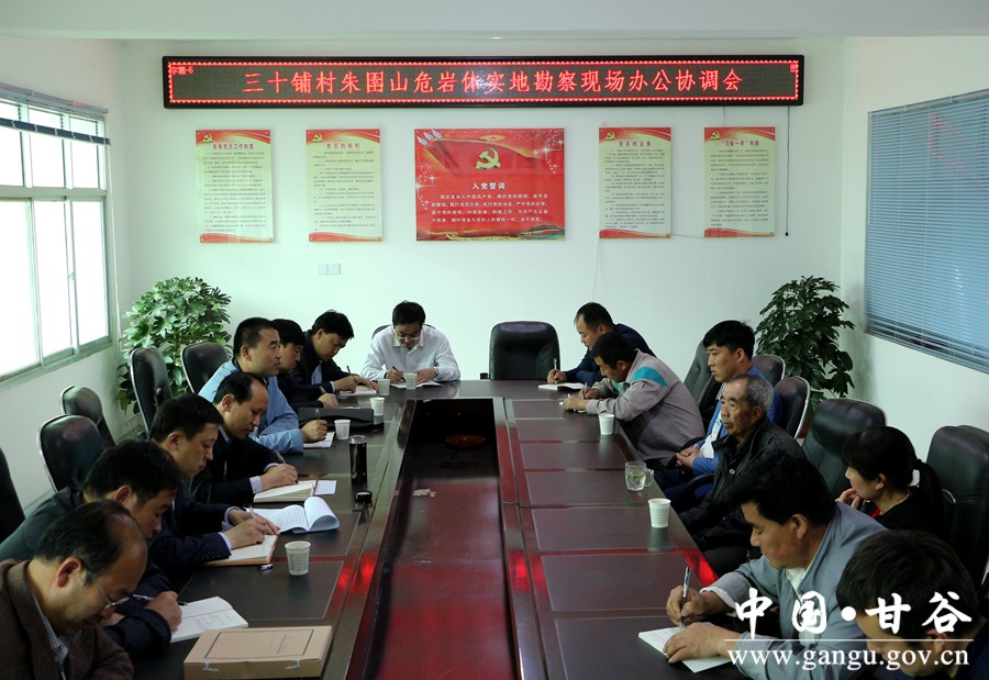 5月4日,县委书记贾忠慧,副县长马福胜带领县发改局、国土局等相关部门负责人和中国建材地勘中心甘肃总队地质专家,深入磐安镇三十铺村实地勘察朱圉山岩体险情,现场协调解决隐患排除、岩体加固工作中遇到的困难和问题。 协调会上,地质专家详细介绍了朱圉山岩体险情现状、隐患发展趋势、岩体加固作业的可操作性等情况;县国土局、发改局、磐安镇负责人结合各自职责实际,围绕隐患监测、项目申报、安全警示等工作作了发言;部分群众代表作了发言。