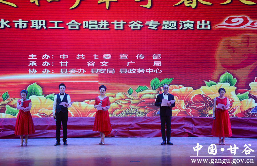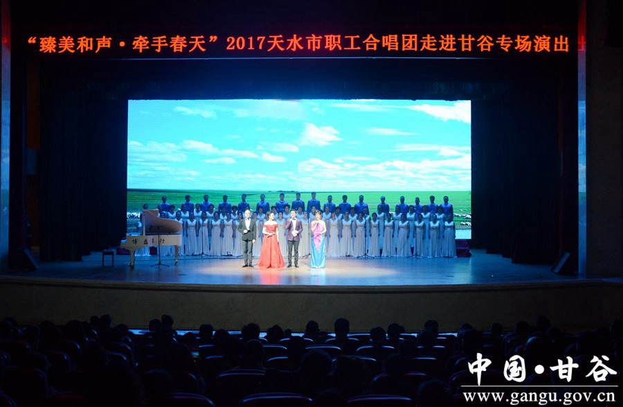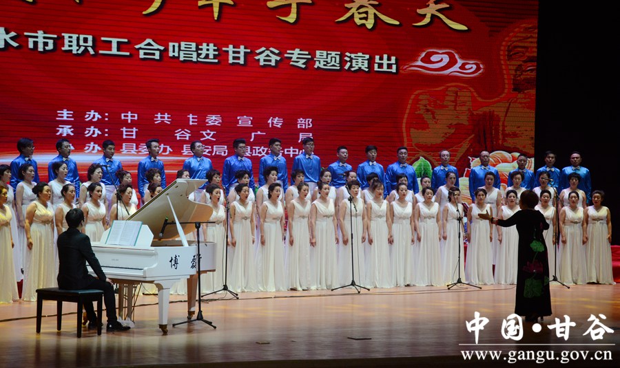 4月28日晚,甘谷大剧院光影交织,歌声嘹亮。由中共甘谷县委宣传部主办,县文广局、天水市职工合唱团共同举办的“臻美和声·牵手春天”走进甘谷专场演出在这里激情上演。县委书记贾忠慧、县政协主席马骥等县四大组织领导和部分干部职工、各界群众1000多人一同观看演出。