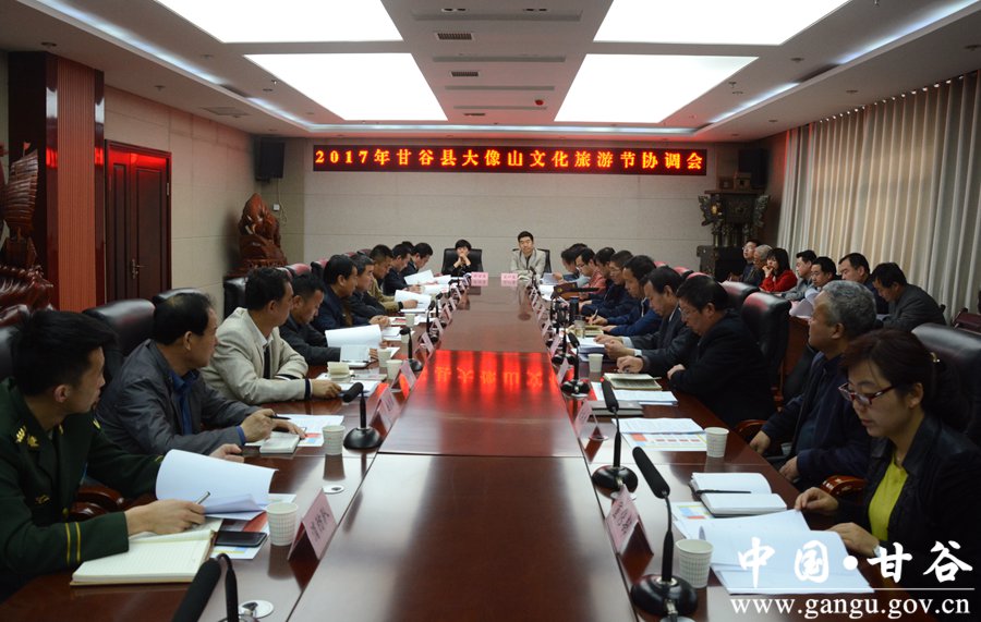 4月18日,甘谷县召开2017年大像山文化旅游节协调会议。县委常委、宣传部长张庆元,县人大常委会副主任王金生,副县长牛武军出席会议;大像山文化旅游节领导小组成员单位负责人参加会议。 会上,张庆元作了讲话;县文广局负责人宣读了《甘谷县2017年大像山文化旅游节活动方案》;县体育中心负责人宣读了《2017年中国·甘谷“姜维杯”青少年俱乐部邀请赛暨天水市第二届青少年武术俱乐部联赛方案》;与会人员分别围绕各自职责分工就办好本届文化旅游节提出了意见建议。