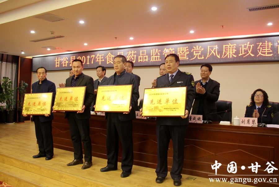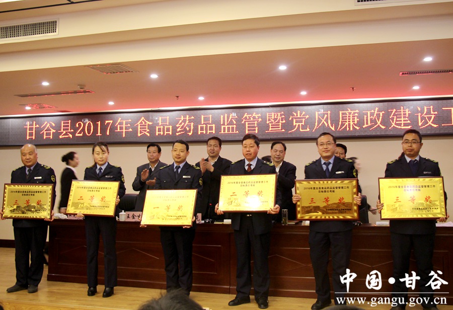 3月28日,甘谷县召开2017年食品药品监管暨党风廉政建设工作会议,贯彻落实省、市食品药品监督管理工作会议精神,总结2016年工作,分析当前工作形势,安排部署今年重点任务。县委常委、宣传部长张庆元主持会议;县委常委、副县长王志高,县人大常委会副主任王金生,县政协副主席董成斌出席会议;县食安委成员单位、各乡镇、基层食品药品监督管理所负责人,县食药监局全体干部职工共计130余人参加会议。 会上,王志高安排部署了今年食品药品监管工作任务,并代表县食安委与各成员单位签订了目标管理责任书和党风廉政建设目标管理责任书;县食药监局负责人与各乡镇食药监所签订了目标管理责任书和党风廉政建设目标管理责任书。会议表彰了2016年度食药监工作先进单位、先进乡镇、先进基层所和先进个人。