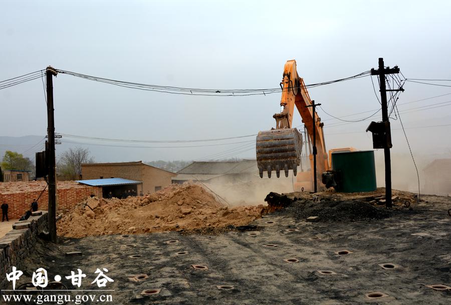 3月29日,伴随着挖掘机的轰鸣声,位于姚渭路旁的两处违法砖厂被依法拆除。这是甘谷县新兴镇全力推进环保专项行动的一次“亮剑”行动。
