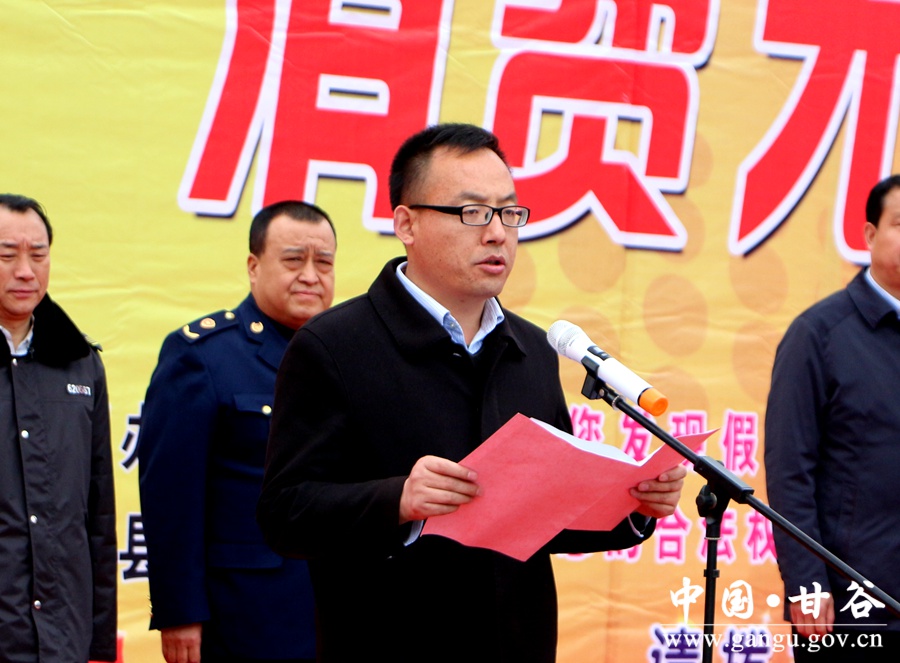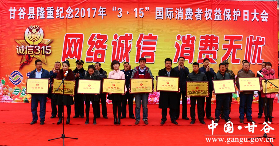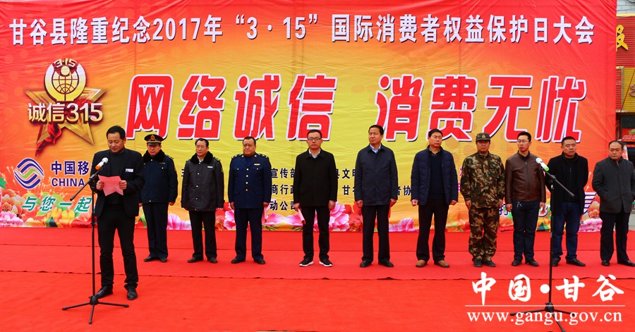 3月15日,甘谷县举办“网络诚信 消费无忧”消费者权益保护日活动。县委常委、宣传部长张庆元,县人大常委会副主任刘永仁,副县长郭小鹏出席活动;县“3•15”活动协调领导小组成员单位负责人、干部职工及部分企业代表共计400多人参加活动。 活动中,张庆元作了讲话;县工商局负责人介绍了全县消费维权工作开展情况;企业代表宣读了“网络诚信 消费无忧”活动倡议书;现场表彰了34家诚信单位和守合同重信用企业。