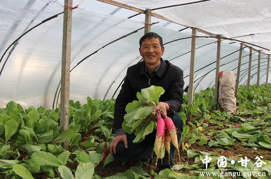 甘谷县蔬菜种植业缘何受到群众的青睐?带着疑问,记者采访了县蔬菜发展中心主任金菊琴。“近年来,甘谷大力推进农业标准化示范区建设,全县新建无立柱钢架大棚8000多亩,蔬菜总产量达75.26万吨,蔬菜总产值12.69亿元。建成了集育苗、科研、农技、营销、农产品服务、检测“六位一体”的省级现代农业示范园,形成了以“春萝卜套茄果类套叶菜类”的一年三茬种植模式,大棚蔬菜已成为群众脱贫致富的铁杆庄稼。”