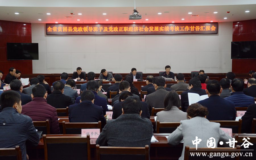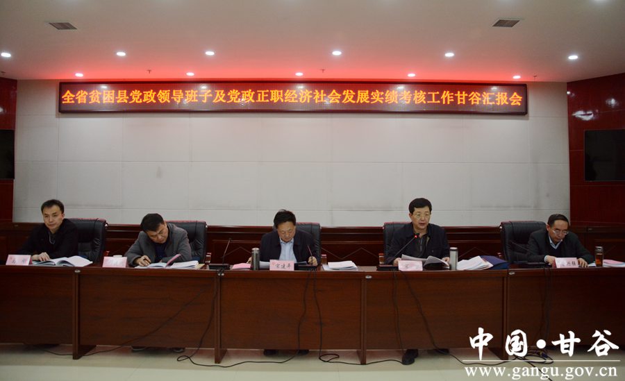 3月7日,全省贫困县党政领导班子和党政正职经济社会发展实绩第八考核组第二考核小组对甘谷县党政领导班子和党政正职2016年度经济社会发展实绩及脱贫攻坚工作成效进行考核。 省第八考核组第二考核小组组长、省扶贫办人事处处长宋雷,考核组成员、省环保厅双联办副主任邓建洲,市人大常委会副主任宋建平,市委考核办副主任曹兴强参加考核。宋建平主持考核汇报会。县委书记贾忠慧,县委副书记、县长申君明,县政协主席马骥等县四大组织领导及县直相关部门单位负责人参加汇报会。