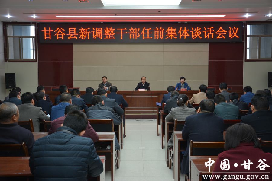 3月8日,甘谷县召开新调整干部任前集体谈话会议。县委书记贾忠慧,县委常委、纪委书记谢辉,县委常委、组织部长冯建新出席会议;新调整干部参加会议。 会上,贾忠慧作了讲话;冯建新主持会议并宣读了有关任免文件。