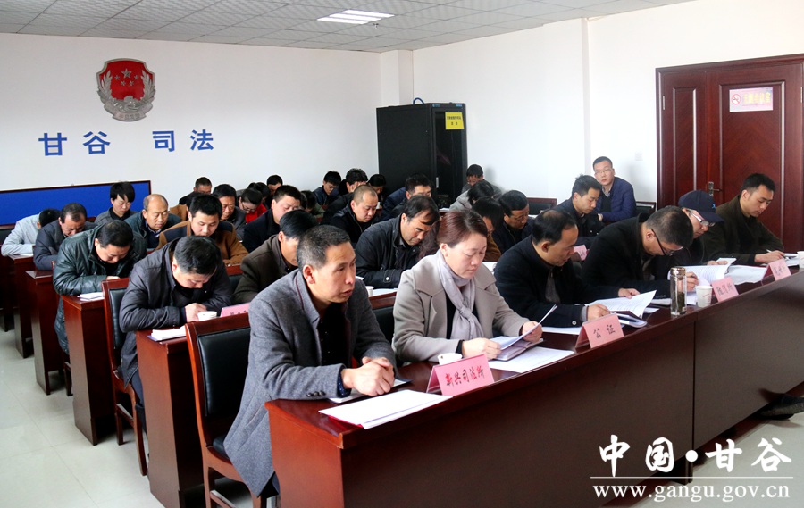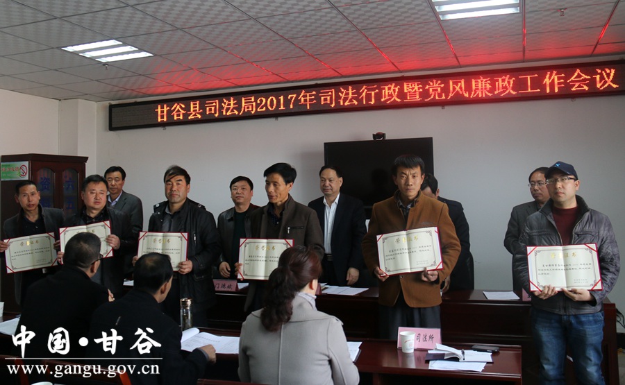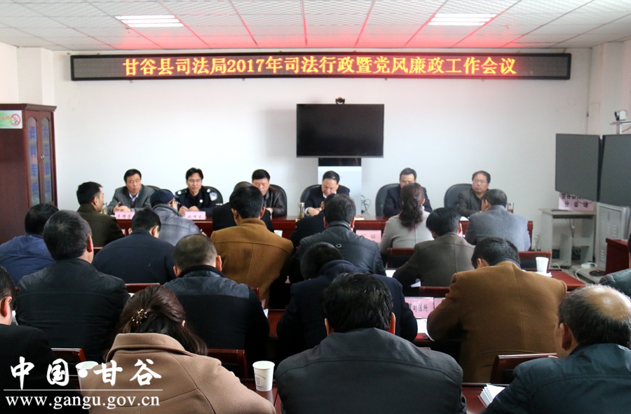 3月2日,甘谷县司法局召开2017年司法行政暨党风廉政工作会议,传达学习中央、省、市司法行政工作会议精神,回顾总结去年工作,表彰奖励先进单位,安排部署2017年工作任务。县委常委、副县长王志高出席指导会议;局党委全体班子成员,各乡镇司法所所长,律师事务所、公证处负责人及局机关股室干部职工共计60余人参加会议。 会上,王志高作了讲话;县司法局负责人作了司法行政和党风廉政建设工作报告,并与各乡镇司法所、律师事务所、公证处及局机关股室签订了2017年目标管理责任书。