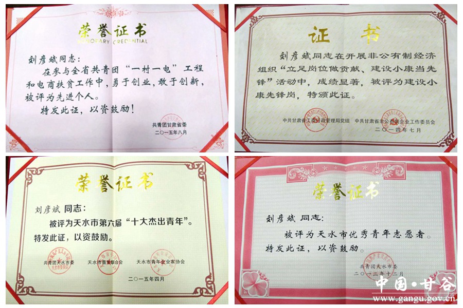 他个人及其公司也因创富带富、热心公益,先后得到了各级政府的表彰奖励,2015年、2016年被团省委评为“一村一电”工程和电商扶贫工作“先进个人”,树立为甘肃省“学子返乡·精准扶贫”典型代表;2014年被省工商局党组、非公企业工委评为“建设小康先锋岗”。2012年、2013年、2015年荣获天水市首届“十佳农村青年致富带头人” “天水市优秀青年志愿者” 第六届“十大杰出青年”和首届“十大青年创业致富带头人”等荣誉称号;2013年被甘谷县委评为“优秀共产党员”。“天水生活网”于2014年被市委宣传部评为“2014年度最佳服务品牌”;2013年被县委评为“先进基础党组织”; 2016年华晟广告传媒有限公司荣获天水市消费协会2015年度“诚信单位”荣誉称号,也被县工商局评为2015年度“守合同、重信用”优秀企业。 “输血不如造血,授鱼不如授渔。‘互联网+’实现了我的梦想,也让我认识到创业带富、参与公益所体现的社会价值。帮一把手,扶一把力,创业就是真正帮助群众一起脱贫致富。”带着梦想,刘彦斌仍旧奔忙在创业带富的途中。 (责任编辑:黄鑫)