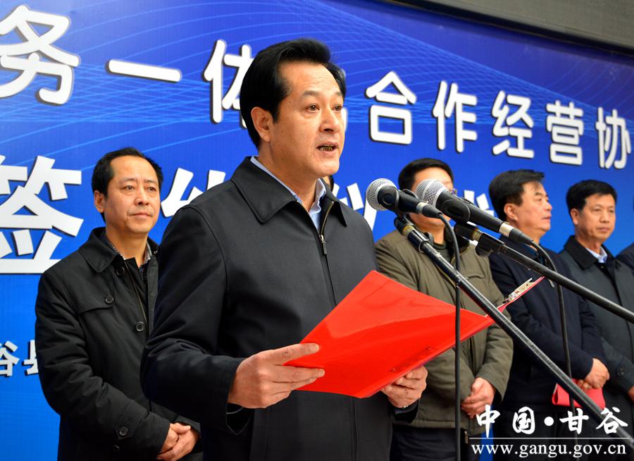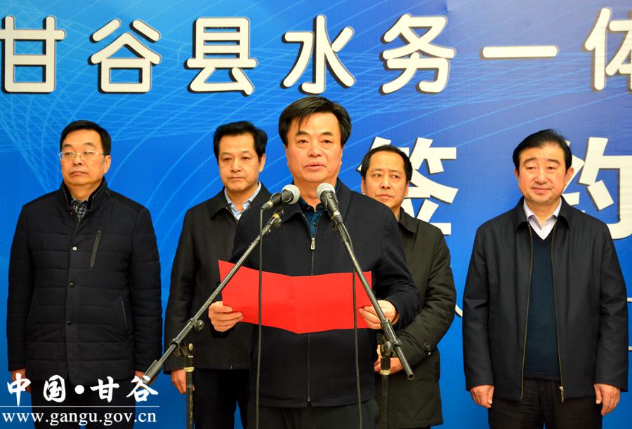 申君明在致辞中说,甘谷县水务一体化合作经营项目,是县委、县政府招商引入的一项模式先进、互惠共赢的合作共建项目。旨在解决城市供水短缺,提升农村安全饮水质量,实现供水经营管理精细化和现代化。该项目采用BOO合作方式,按照“股份出资、行业监管、特许经营”的思路,由甘谷县政府与甘肃省水务投资有限责任公司合作实施。项目启动实施后,将从根本上解决全县城乡供水问题,对进一步保障和改善民生具有十分重要的意义。 申君明要求,各相关部门和单位要切实担负起协调服务和监督管理职能,全力配合支持水务一体化合作经营项目。县财政局要主动衔接、积极配合,尽快与省水投公司组建成立甘肃水务甘谷供水公司;县建设局、水务局要全程跟踪服务,及时协调解决项目实施过程中遇到的困难和问题;国土、规划、环保等部门要加强协作配合,简化办事流程,抓紧办理项目前期手续;大像山、新兴、磐安、六峰等乡镇要抓好征地拆迁,及时保障项目用地;发改、质监等部门要加强监督管理,督促加快建设,确保工程质量;自来水公司要尽快完成清产核资,稳妥做好资产和人员的整体划转工作,确保项目早日建成投用、群众早日受益。