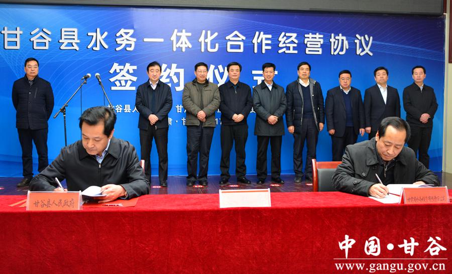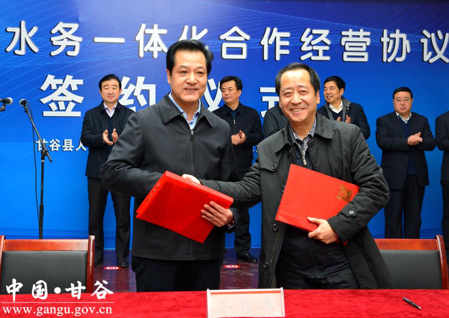 1月23日,甘谷县人民政府与甘肃省水务投资有限责任公司举行水务一体化合作经营协议书签约仪式。县委副书记、县长申君明与省水投公司总经理霍子俊签订了甘谷县水务一体化合作经营协议。县委副书记任佩光主持签约仪式。