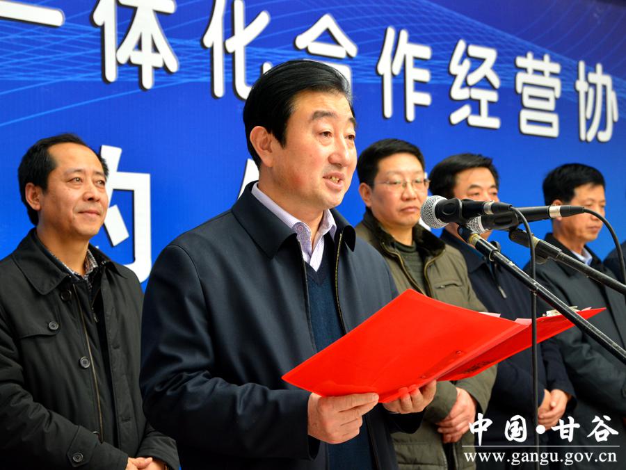 徐崇锋在致辞中说,近年来,甘谷县委、县政府团结带领全县人民,抢抓政策机遇,深入实施富民强县战略,全县经济快速增长、民生持续改善、各项事业协调发展。特别是以解决民生水利问题为重点,扎实推进水利改革与发展,取得了良好成效。省水投公司是省委、省政府授权负责全省水资源开发、建设和经营的大型国有企业,也是省委、省政府批准成立的以公共服务为主、融合投融资和生产经营功能的综合性国有企业。 徐崇锋强调,省水投公司与甘谷县政府两家联姻签署合作协议,标志着省水投公司全面参与甘谷县水资源开发建设、与甘谷县携手推进水务一体化经营进入实质性阶段,也为公司深度参与地方水资源开发、全面拓展水务一体化经营市场提供了重要机遇。我们将以此为契机,立足水投、扎根甘谷,以创新务实的精神,认真履行承诺,与甘谷县委、县政府一道,共同规划好、建设好、经营好、管理好一体化供水市场;同时,将尽快完善工程设施,建立健全市场运作机制,充分发挥市场职能,积极创造条件,逐步实现对农村供水工程的全面经营管理,为城乡居民提供安全可靠的供水保障和优质服务,为甘谷经济社会发展提供强有力的水资源保障。