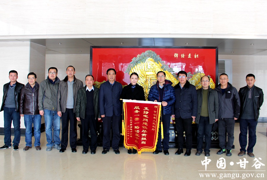 1月22日,甘肃省电力公司总经理助理张建明受公司党组委托将一面印着“支持电网建设尽责担当 服务一带一路功在千秋”烫金大字的锦旗送给甘谷县人民政府,感谢县政府大力支电网建设,为企业排忧解难。副县长高丽及县供电公司负责人参加赠送仪式。