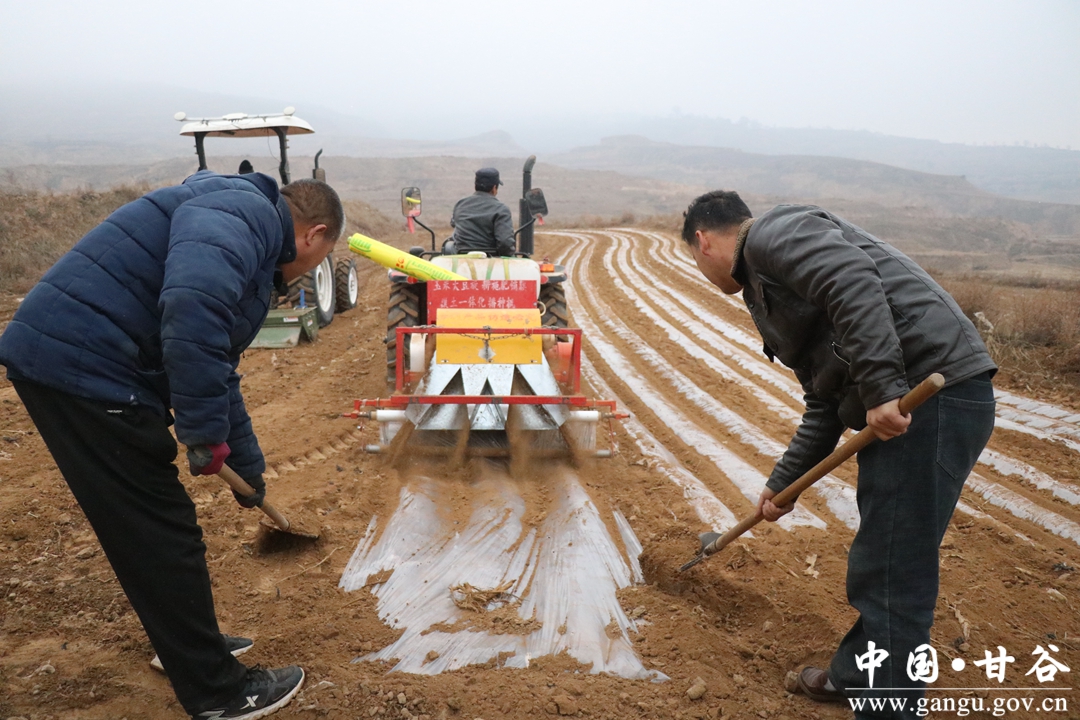 强化春耕“生产力”,积极推进顶凌覆膜。今春以来,甘谷县抢抓土壤渐次解冻的有利时机,充分利用外出务工人员尚在的便利条件,迅速启动顶凌覆膜工作。一是及时下发了关于开展顶凌覆膜工作的紧急通知,抽调60多名技术人员组成了15个技术服务小组,以示范区、农民专业合作社和种植大户为重点,分赴全县各乡镇开展覆膜技术指导,共举办实用技术培训8期。二是坚持集中连片、点面结合的方式,依托农民专业合作社、家庭农场等新型经营主体,投入人力起垄机600台、机械牵引起垄覆膜一体机200台、拖拉机及旋耕机等配套机械150台(套),已建成大石镇河南流域、谢家湾乡鲜家坪流域、西坪镇马家河流域等示范点45个,其中,千亩以上的示范点12个,500亩以上示范点6个,百亩示范点有26个。