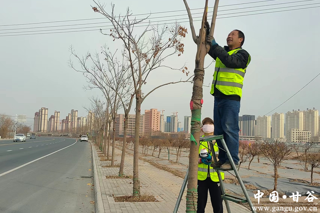 种绿更要护绿,在甘谷县渭北十里生态绿廊,工人们正忙着清理树下的杂草,修剪栾树的杂枝和涂抹封口愈合剂,优美、舒适的园林绿地景观效果得到了进一步提升。