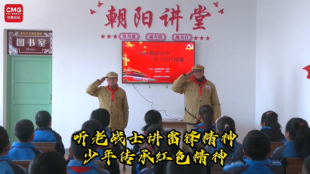 在甘谷县八里湾镇的朝阳讲堂,白发与红领巾一同飘扬,90岁抗美援朝志愿军老战士王绍林、71岁的退役老战士张海中两位革命前辈给当地小学生们讲述雷锋精神的时代内涵和革命故事。