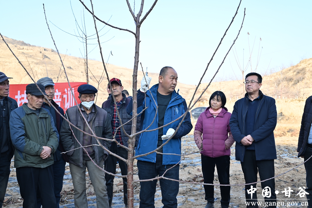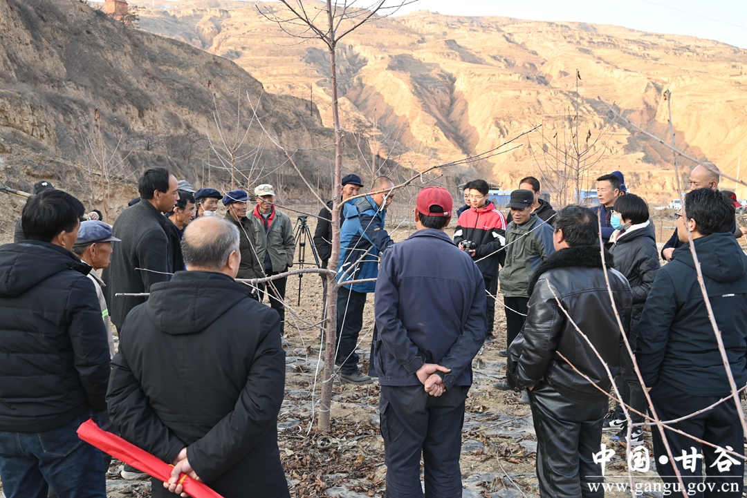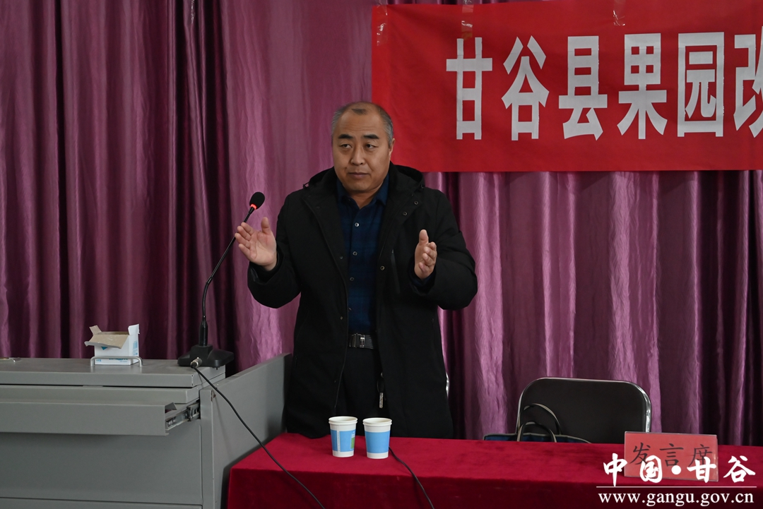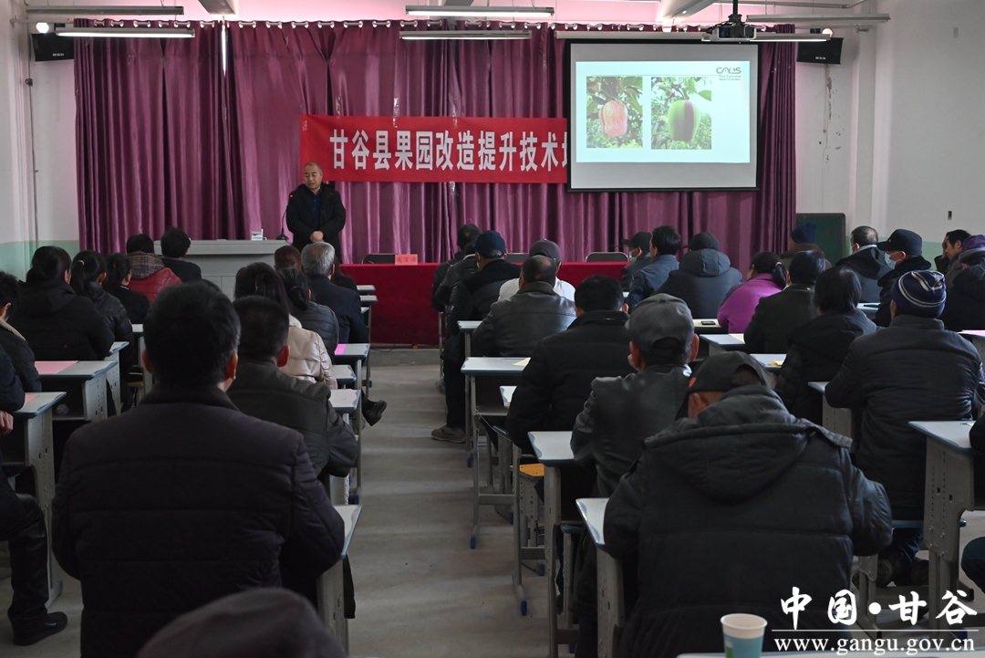 在谢家湾乡永丰初级中学,来自天水市果树研究所的正高级农艺师张守江等专家正在为前来学习果树种植的果农们讲课,围绕苹果产业发展趋势、品种引进推广、果园技术管理做了详细的讲解。