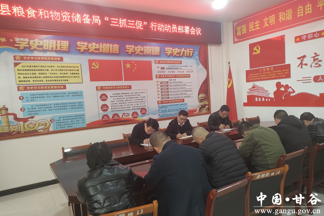 2月24日,甘谷县粮食和物资储备局召开 “三抓三促”行动动员部署会议。传达学习全省“三抓三促”行动动员部署会议精神和全县“三抓三促”行动部署要求,宣读了《甘谷县粮食和物资储备局“抓学习促提升抓执行促落实抓效能促发展”行动实施方案》以及“三抓三促”行动领导小组组成人员名单和工作职责,对粮食和物资储备局深入开展“三抓三促”行动进行动员部署。