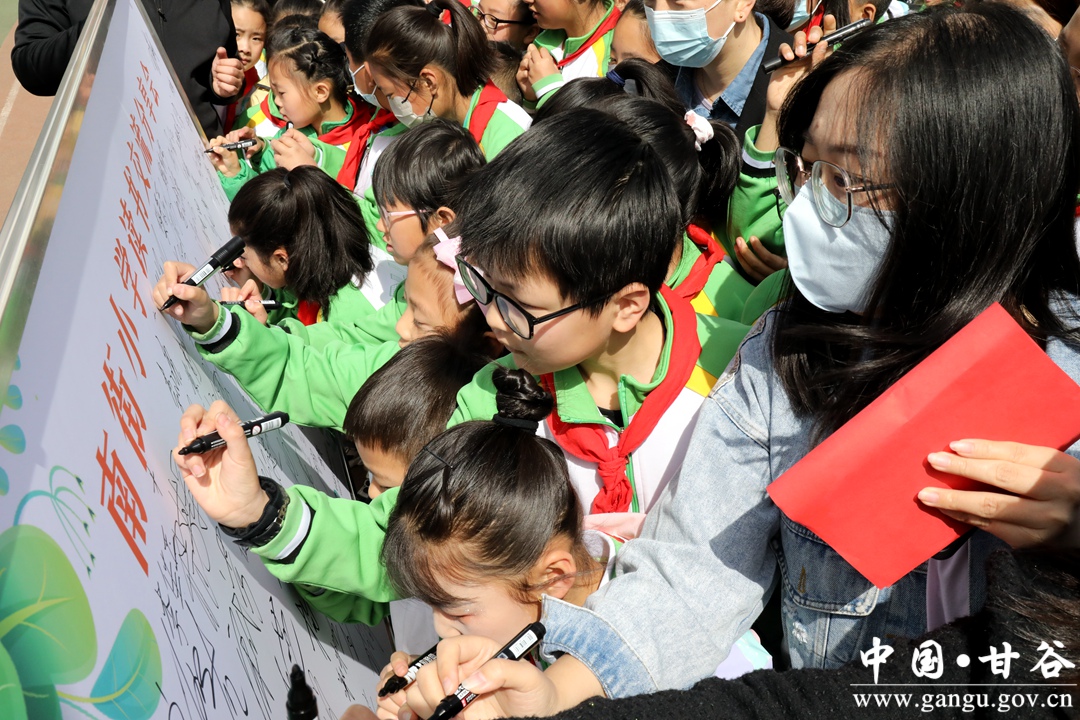 (学生们在书香校园、书香班级签名墙上签名)