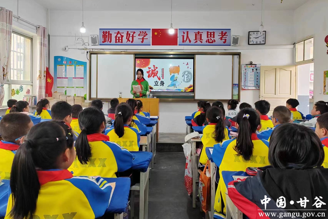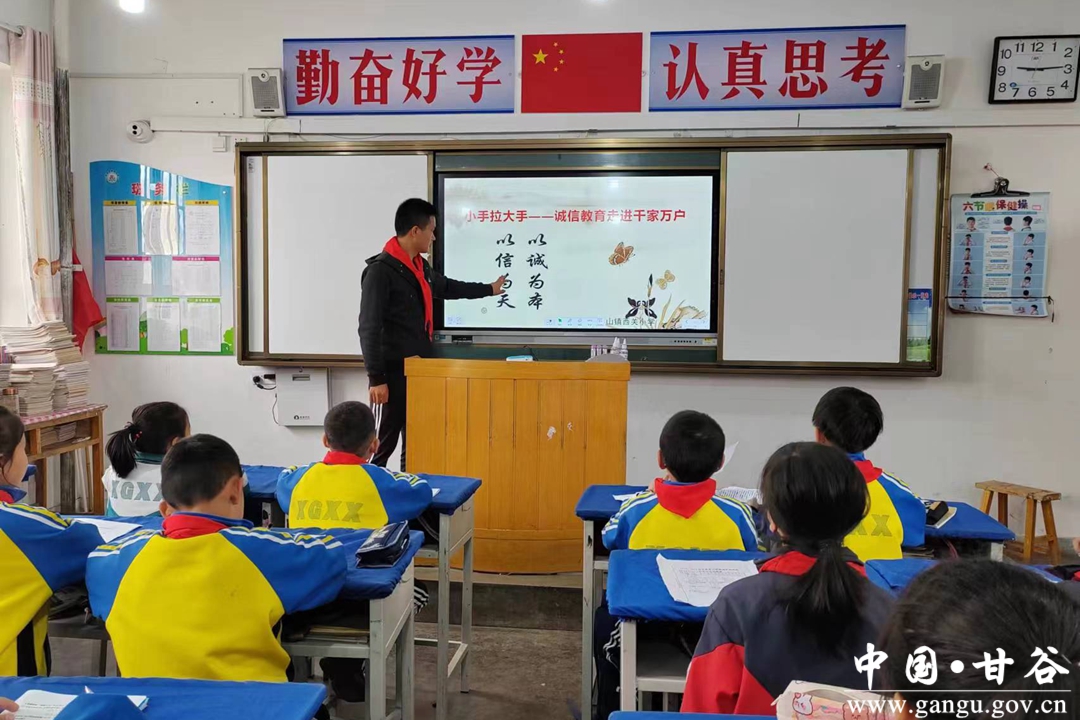 甘谷县教育局结合中小学实际,从不同年龄段的学生实际教育需求出发,把“诚信”作为教育主题,开展以争创“诚信文明班级”“诚信文明学生”作为主线的系列活动,使不同年龄段的学生都能养成良好的道德品质。开展丰富多彩的“诚信教育”“小手拉大手——家庭诚信传、帮、带”等不同主题的宣传活动。