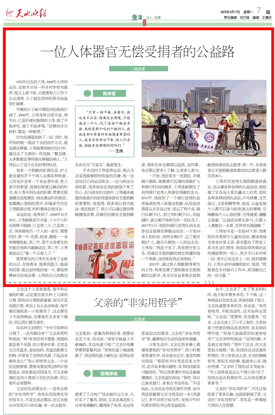 2015年,通过他人捐献获得重生的王伟,郑重签署了遗体器官无偿捐献的志愿书,成为甘谷县首批无偿捐献遗体器官的志愿者。那一年,甘肃省登记无偿捐献遗体器官的志愿者人数仅有28人。